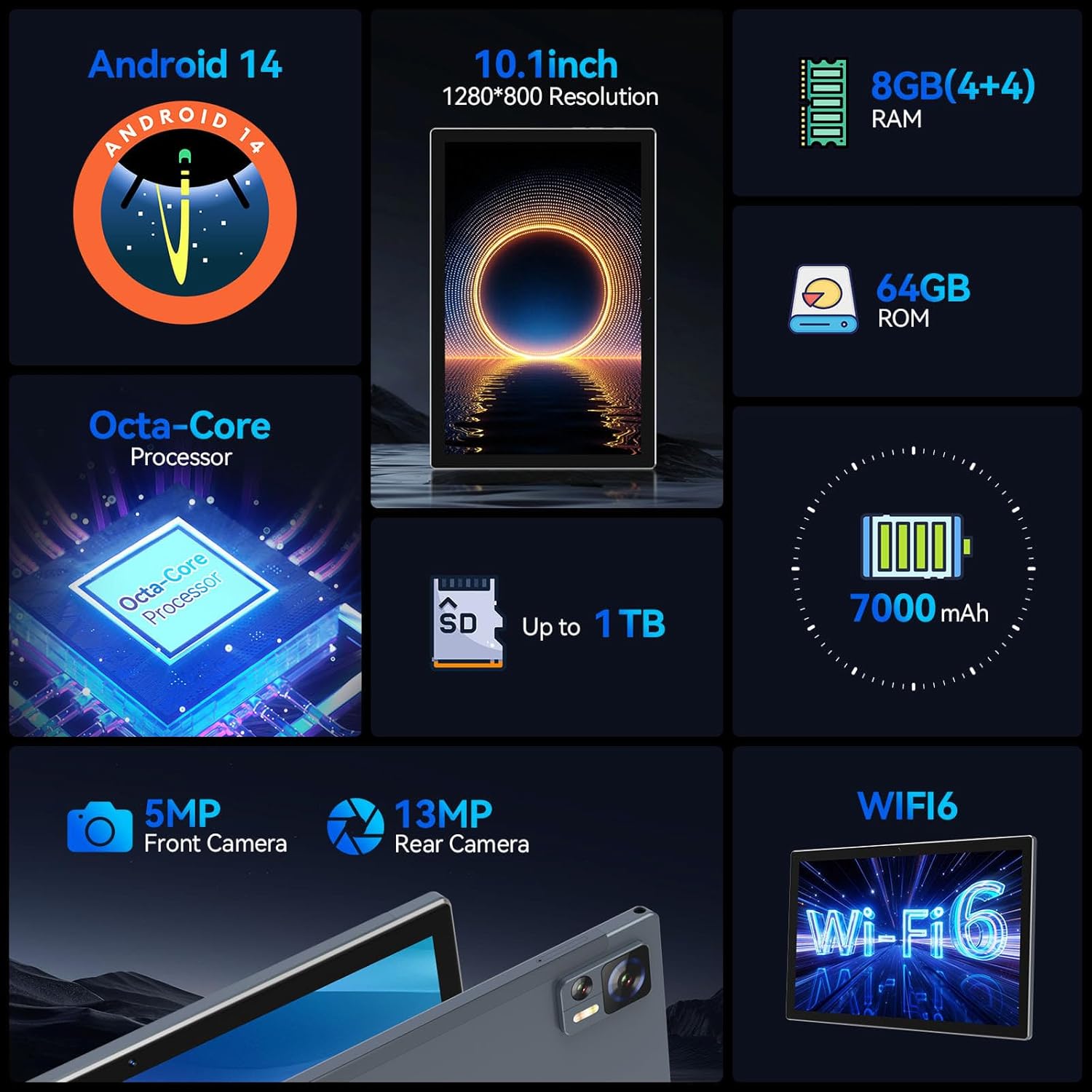 10.1 inch Android 14 Tablet 2025 Latest Update Octa-Core Processor with 64GB Storage, WiFi 6 Tableta, 13MP+5MP Dual Camera, 2 in 1 Tablet with Keyboard, Bluetooth, FHD IPS Screen, Mouse, Case, Stylus