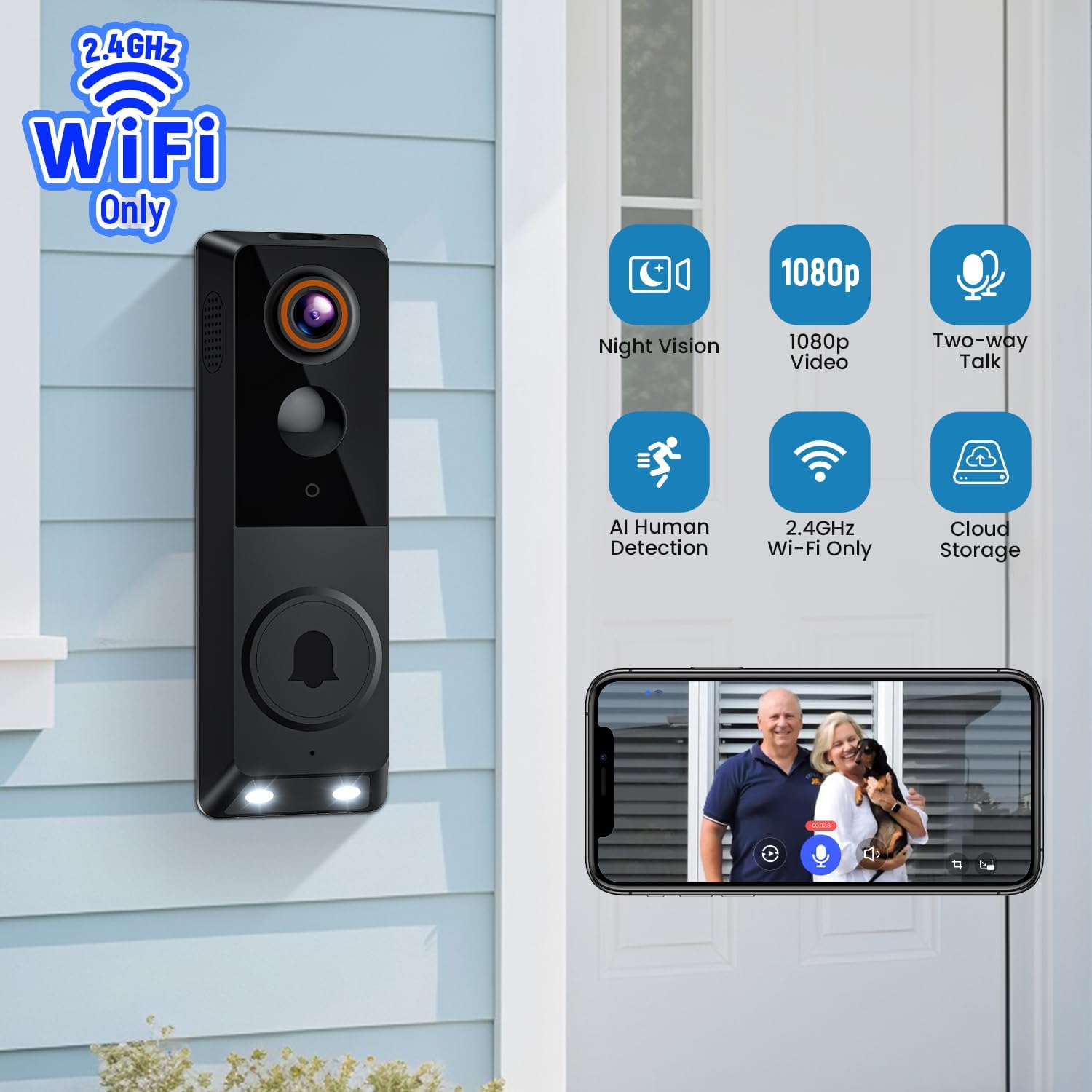 1080p Smart Wireless Doorbell Camera, Ai Human Detection,Real-Time Alerts, Night Vision in Full Color, 2-Way Audio, Battery Powered, Cloud Storage Service (Sold Separately), 2.4Ghz WiFi Only