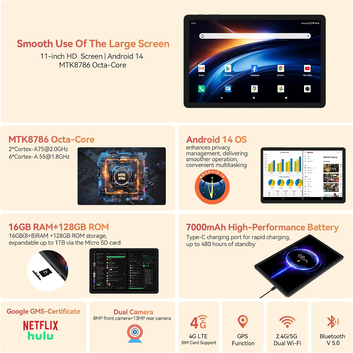 【16GB+128GB+1TB Expandable Large-Capacity Tablets】This 11-inch Android 14 tablet features 16GB of memory (8GB physical + 8GB virtual) and 128GB of internal storage, expandable up to 1TB via microSD card (card not included). Allow you to store endless e-books, songs, photos, videos, and games without worry. This expansive capacity ensures a consistently smooth and lag-free experience, even with extensive data.