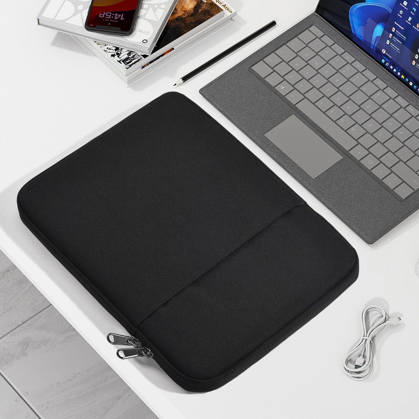 【Extra-Pocket】- The surface laptop Bag features a large front pocket, this sleeve not only protects your precious tablet, but also provides enough space for tablet accessories like phones, cables, mouse, earphone, notes, wallet, cards and more small items.