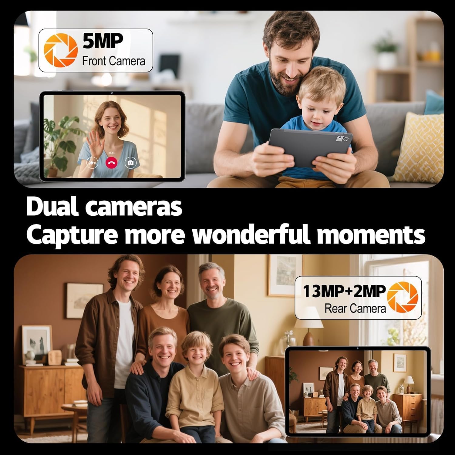 WIFI 5 & Dual Camera: ✔ Android tablet comes with WiFi 5, dual speakers and Bluetooth 5, and supports dual band WIFI for improved network stability and reduced network latency. This tablet comes with an 15 MP rear camera with focus and flash capabilities to ensure clear photos. The 5 MP front-facing camera provides excellent clarity during video calls. The split-screen function makes multitasking a breeze.