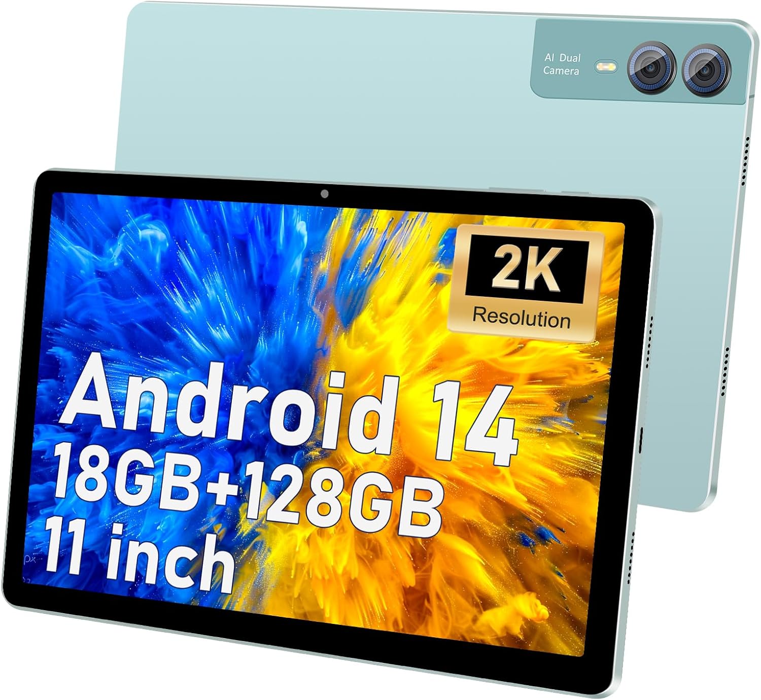 2025 Latest 11 inch 2K Tablet with Keyboard Android 14 2000×1200 2 in 1 Tablets PC, T616 Octa Core, 18GB RAM+128GB ROM, 5+5+13MP Camera, 9000mAh Battery 4 Speakers, 5G WiFi, with Case, Stylus – Green