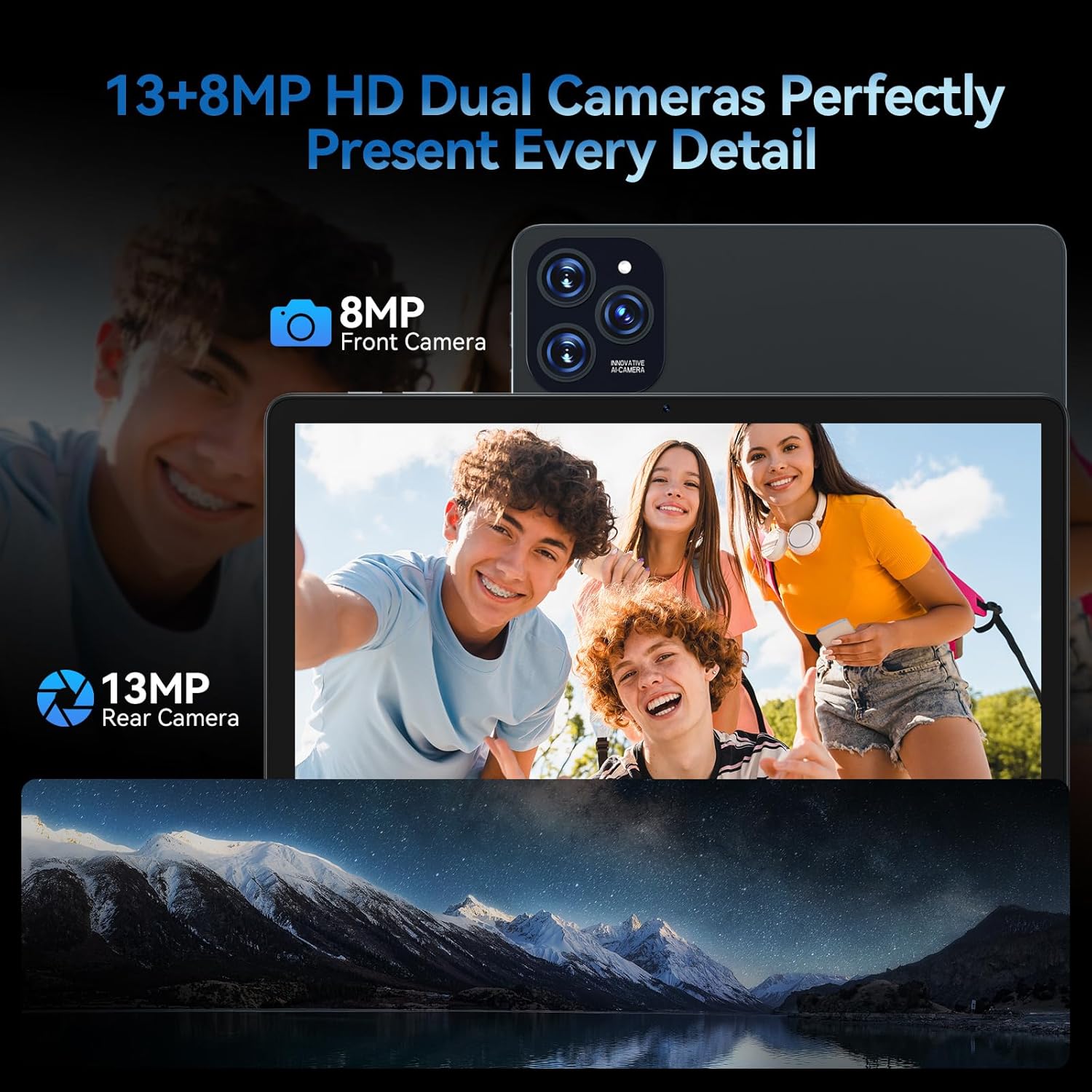 [11 Inch Visual Experience] This Android 15 tablet is equipped with an 11 inch ultra-large HD screen, with more delicate pictures, more refined details, and sharper colors. Whether it is watching movies or browsing, it can bring you an extraordinary experience. The large screen with a soft light curtain can also effectively reduce eye fatigue. This tablet is equipped with dual cameras, a rear 13 MP camera + a front 8 MP camera to capture delicate and exquisite scenes and clear and natural portraits.