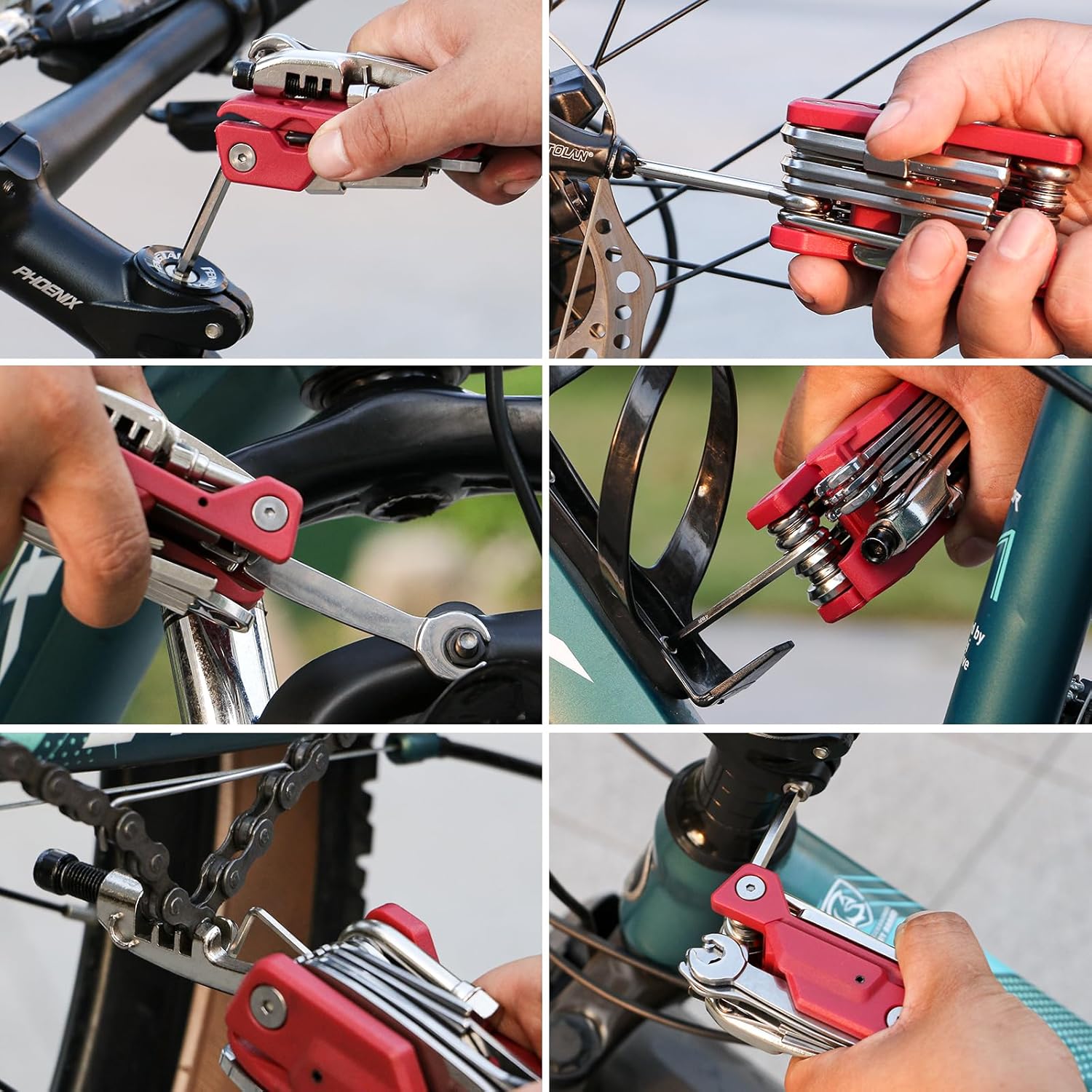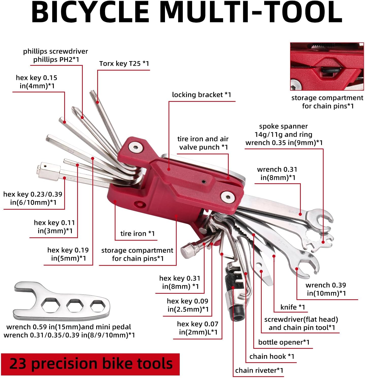 21 in 1 Multi-Function Tool Kits: hex key (2/2.5/3/4/5/6/8/10mm)*1,phillips screwdriver PH2*1,torx key T25 *1,wrench 0.59 in(15mm),mini pedal wrench 0.31/0.35/0.39 in(8/9/10mm)*1,wrench 0.31/0.39 in(8/10mm)*1,bottle opener*1,chain hook *1,chain riveter*1,knife *1,tire iron & air valve punch *1,spoke spanner 14g/15g & ring wrench 0.35 in(9mm)*1,screwdriver(flat head) & chain pin tool*1,storage compartment for chain pins*1,tire iron *1,locking button *1,locking bracket *1.