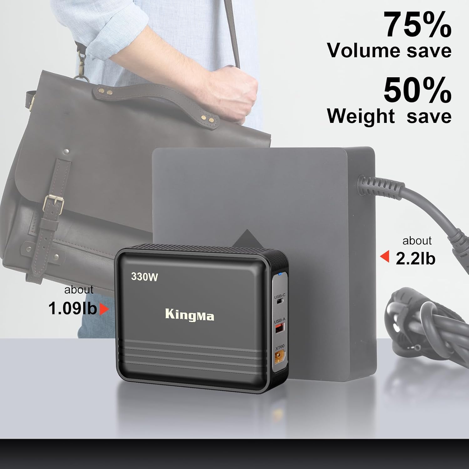 【330W single port output】King Ma laptopt GaN charger design with a XT60 Port,witch can up to 330W single port output,equipt with professional latop cable to charging the professional computer,and there are equiped with a USB-C(100W) and a USB-A(60W) port, for game developers and senior engineers.