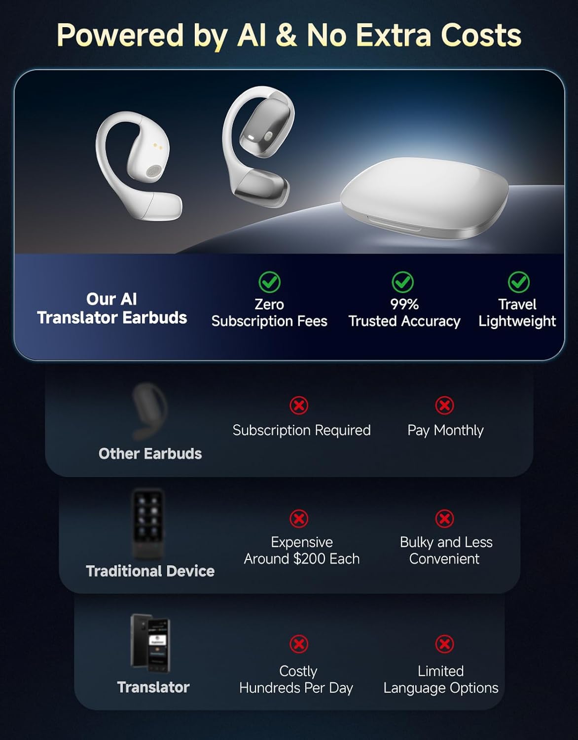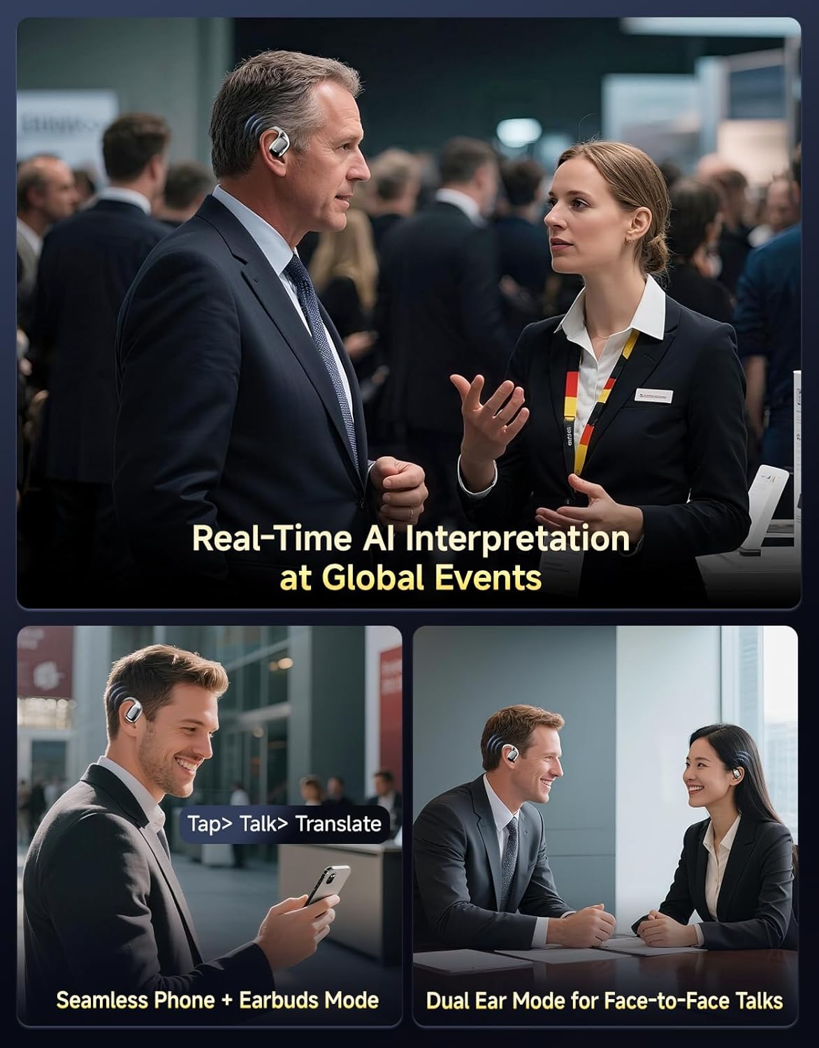 3-in-1 Bluetooth Translator Earbuds: These versatile AI headphones combine real-time translation, high-quality calls, and music playback in a single device. Unlike bulky traditional translator devices, they are lightweight, pocket-sized, and ready anytime—offering a smarter, more convenient, and cost-effective solution for international communication