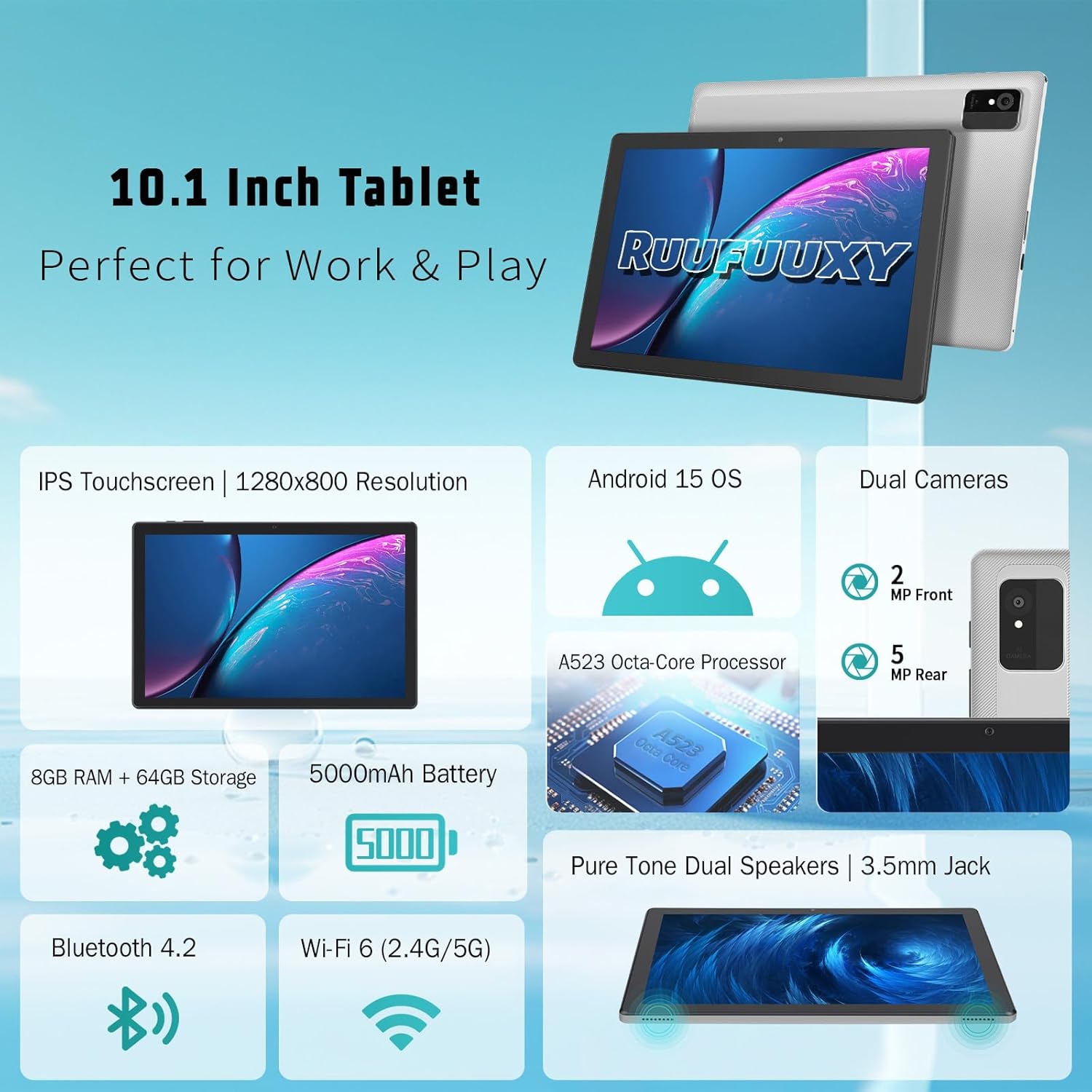 [Android 15 Tablet] The Ruufuuxy tablet runs on the Android 15 system and is powered by an A523 Octa-Core processor. With Google GMS certification, it delivers smooth performance, secure app access, and efficient multitasking. Suitable for work, reading, studying, and entertainment.