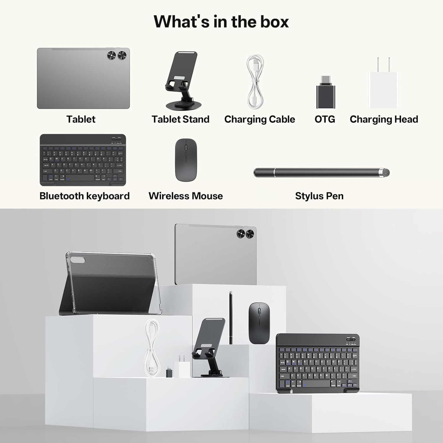 [All-in-one productivity and entertainment] The Higrace 2-in-1 tablet kit instantly transforms your tablet into an all-in-one workstation! It includes a Bluetooth keyboard, mouse, protective case and stylus — everything you need is in one box. Easily switch between tablet mode and notebook mode anytime, anywhere. Perfect for handling office tasks, studying and reading.