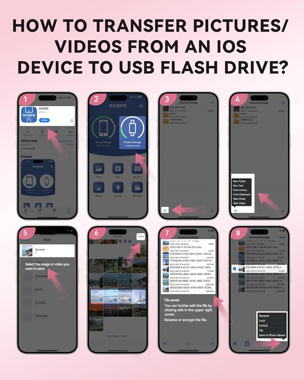 Compact & Convenient: This MFi-Certified 256GB iphone photo storage stick helps you solve storage issues on your iPhone/iPad/PC, allowing you to easily back up your photos, videos, and phonebook with just one click using the app USB drive. (Note: To use this iphone memory stick on an iPhone/iPad, please download and install the “ROSPE” app from the App Store. For Android phones, simply enable the OTG function, no need to download any additional apps.)
