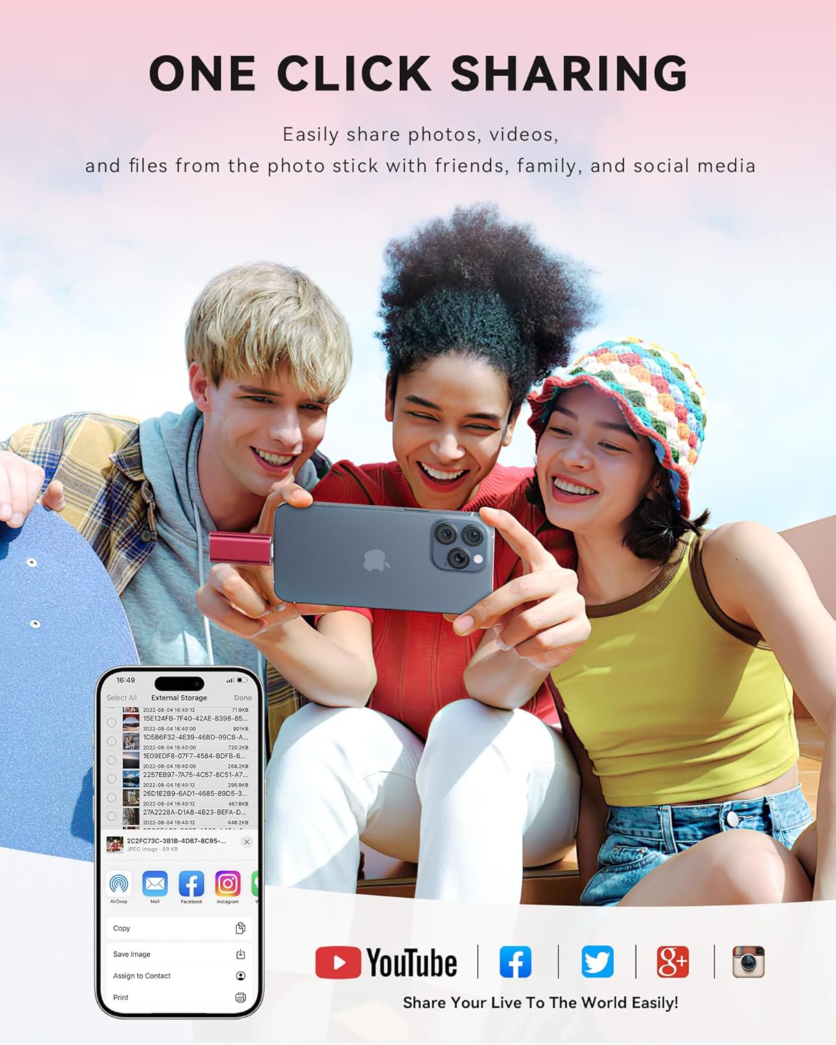 This 256gb flash drive works with iOS 12.1 and newer, OTG Android phones, computers, and USB-equipped devices. Made from sturdy aluminum alloy, it ensures long-term stability. It supports file management for viewing, copying, moving, and deleting files directly on the iphone external storage. With one-click sharing, you can easily share files. Ideal for freeing up iPhone storage space.