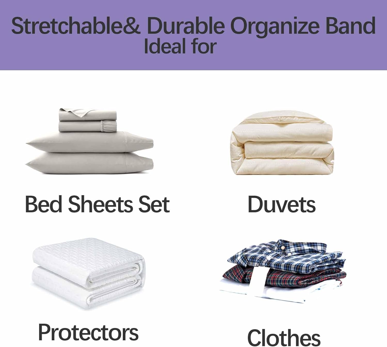 Bed Sheet Organizer Bands, Sheet Set Storage Size Marking Bands, Elastic Bedding Sheet Straps Wraps for Organizing Linen Closet(Queen 4PCs | Purple)