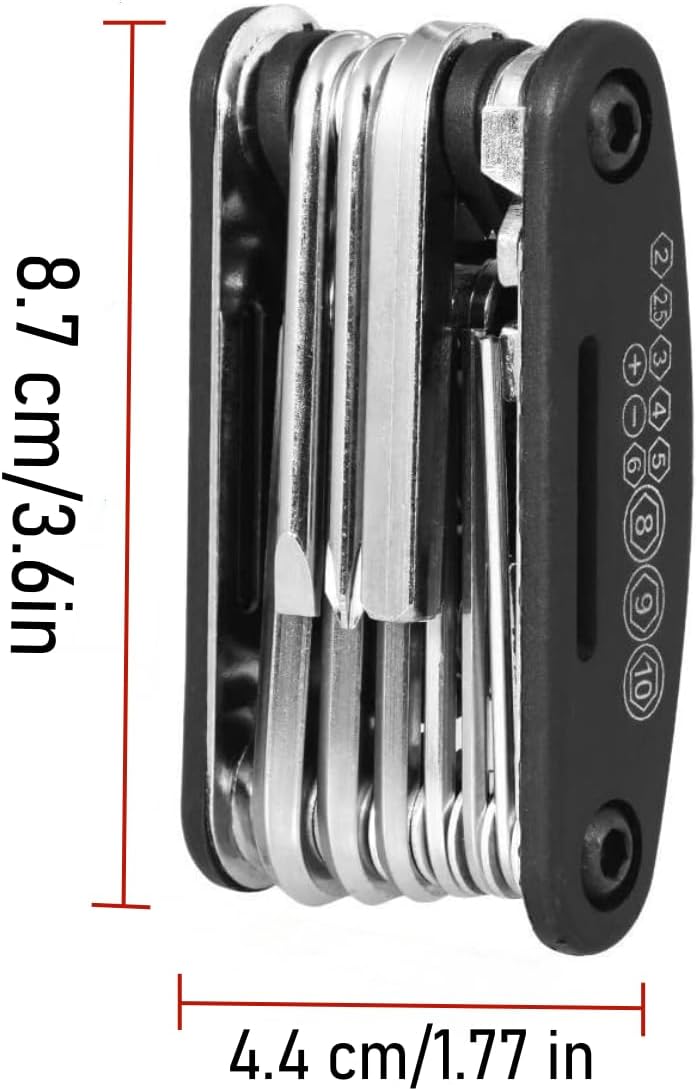 Set includes: 16-in-1 bicycle tool with Allen key (mm): 2/2.5/3/4/5/6; Allen key (mm): 8/9/10 and socket extender; Flat head wrench (mm): 8/10/15, Slotted screwdriver and Phillips screwdriver! Our bicycle repair kit can help you solve most bicycle problems.