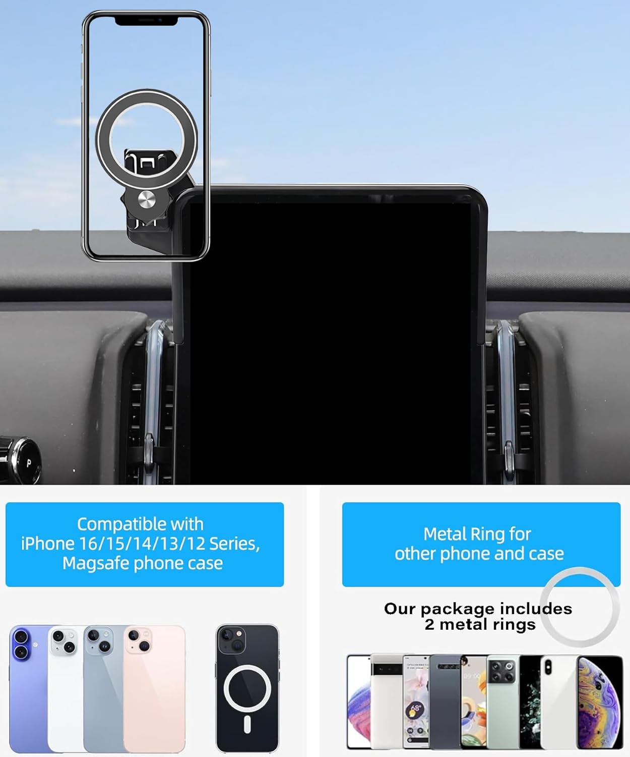 Package includes the mount and two metal rings for universal compatibility. This thoughtful solution keeps your phone within reach while maintaining focus on the road.