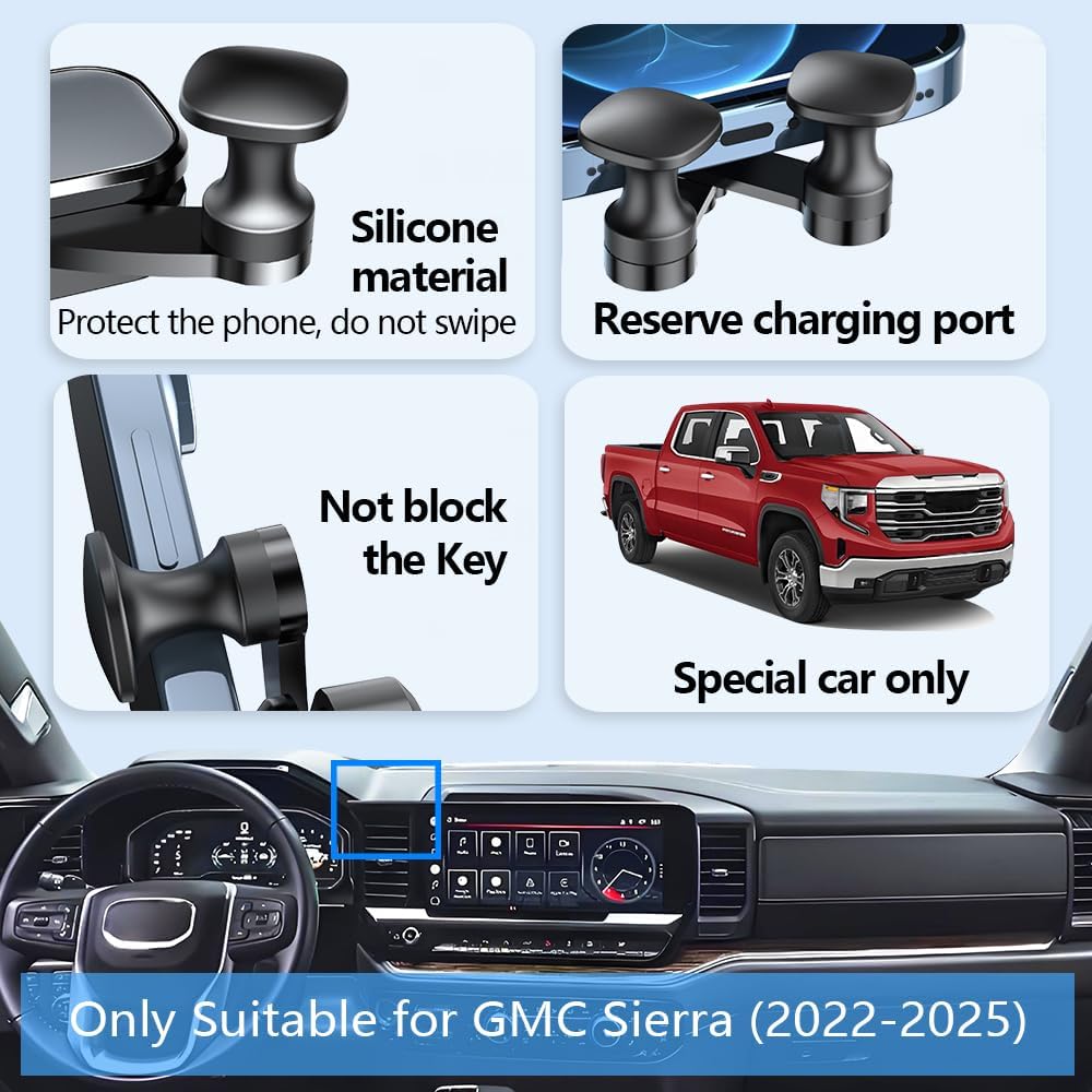 👍【Special Mobile Phone Holder】: Only compatible with GMC Sierra 1500 Elevation/SLE /SLT 2022 2023 2024 2025,GMC Sierra 2500 3500 SLE /SLT 2024-2025 【Only For 13.4-inch screen】. SPECIAL CAR BASE DESIGN, only for a specific model development. Please confirm the model and year of your car before placing the order. Or contact us and send a picture of the central control of your car, and we will help you pick the one.