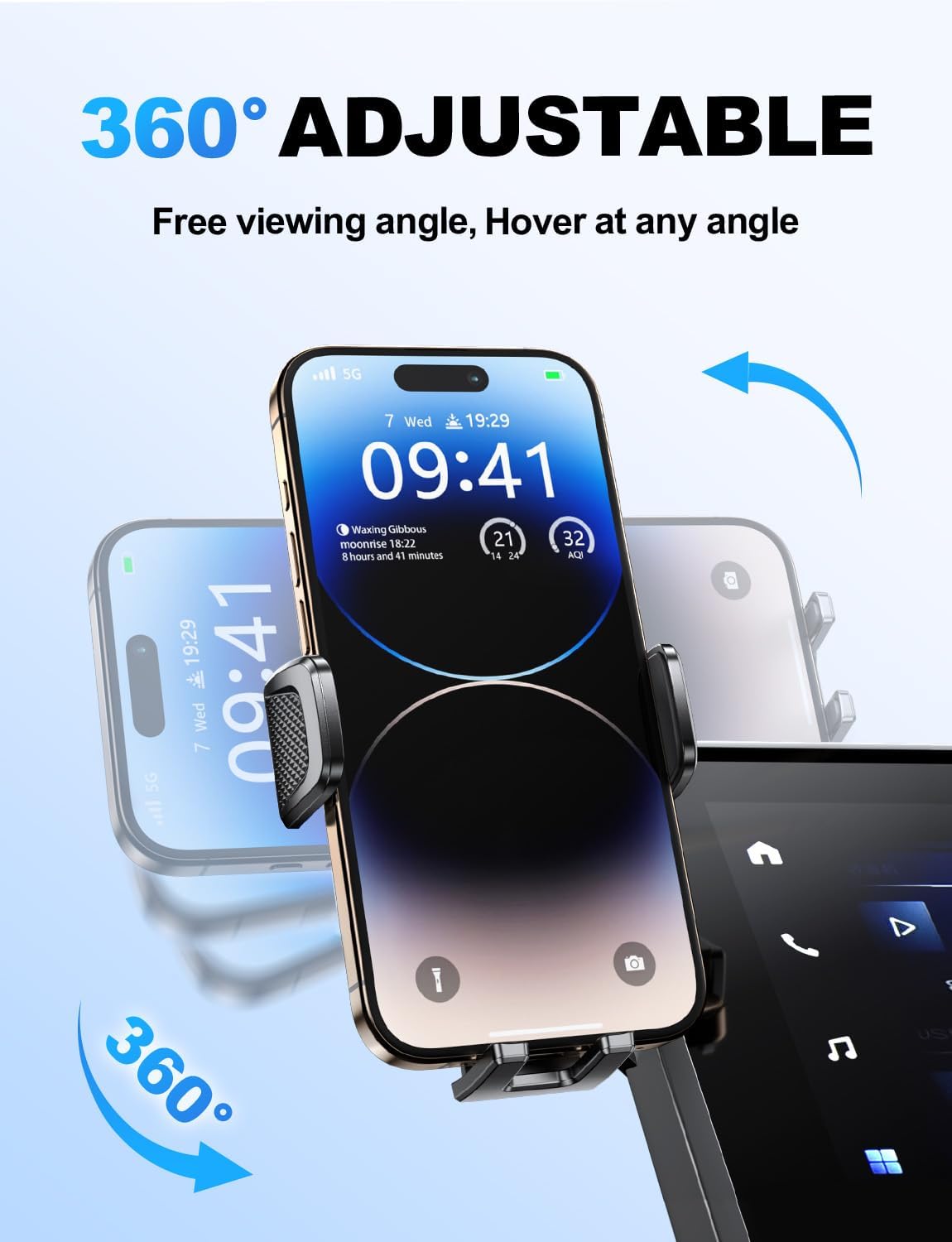 360° Adjustable View + Easy Car Instal:Effortlessly switch between portrait andlandscape modes.Ball head connection design, capable of withstanding tens of thousands of angle rotation adjustments.3D scanning of similar car interiors, 1:1 bonding.The installation will not damage thevehicle and can be removed at any time, can be installed inseconds.