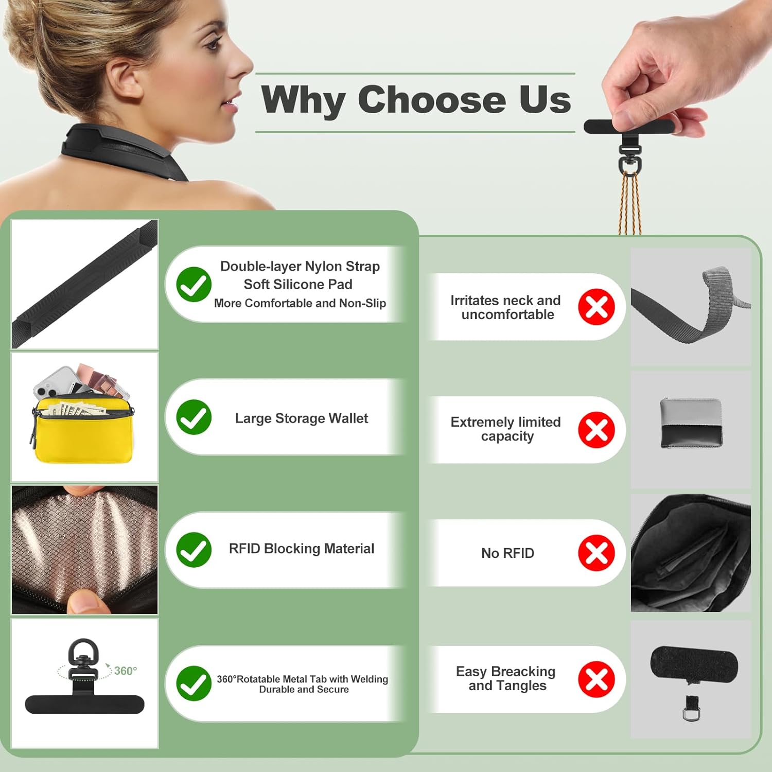 Secure and Worry-Free: Our phone lanyard with wallet includes 2pcs ultra-thin 0.2mm 360°rotatable zinc-alloy phone tabs, it support both wire and wireless charging without removal, and also the tabs are robustly welded to prevent breakage, more durable and secure. The wallet connect strap is crafted from premium nylon fabric, highly resistant to fraying and tearing, ensuring superior strength and durability.