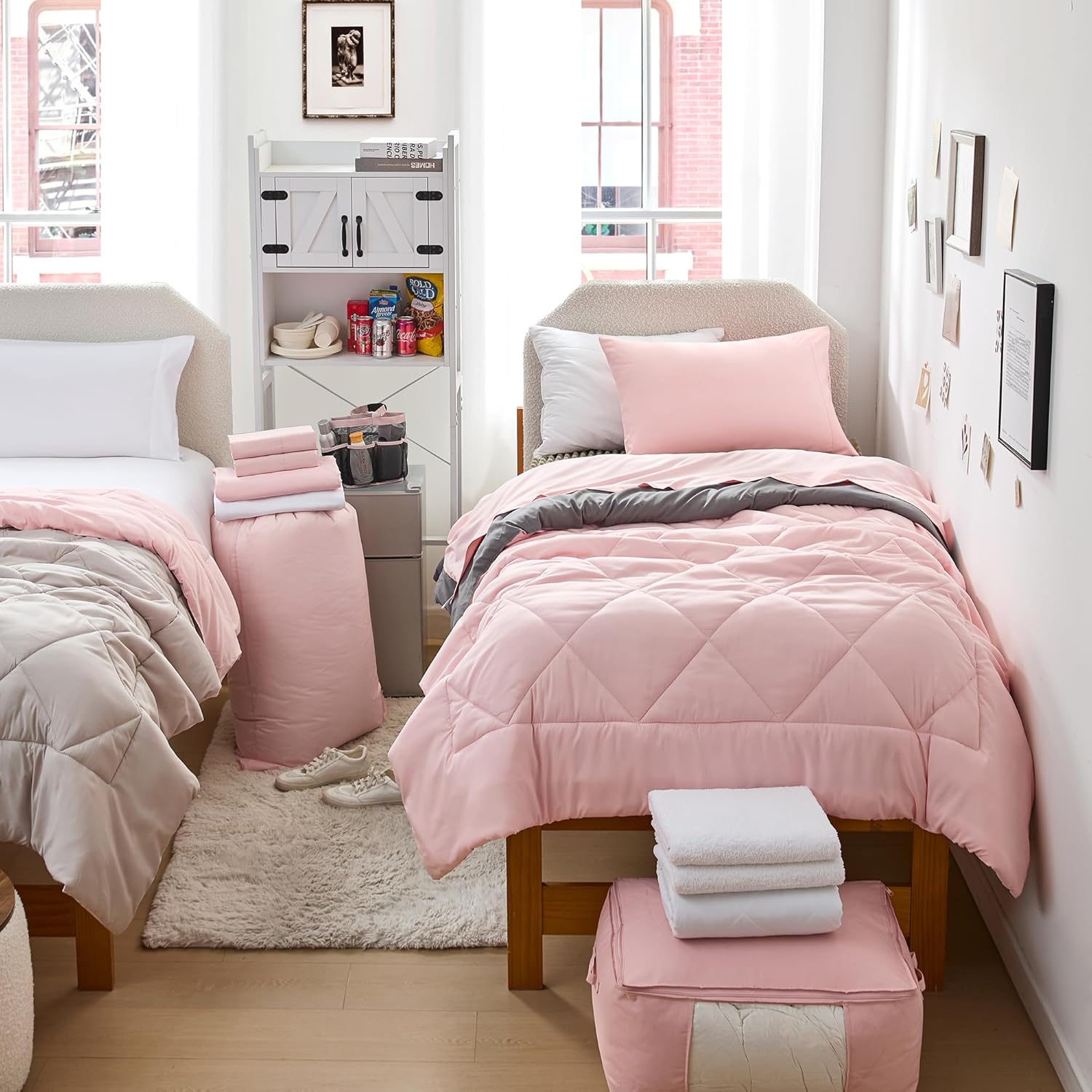 Upgraded Twin XL College Bedding Package – Rose Quartz/Charcoal Color Set