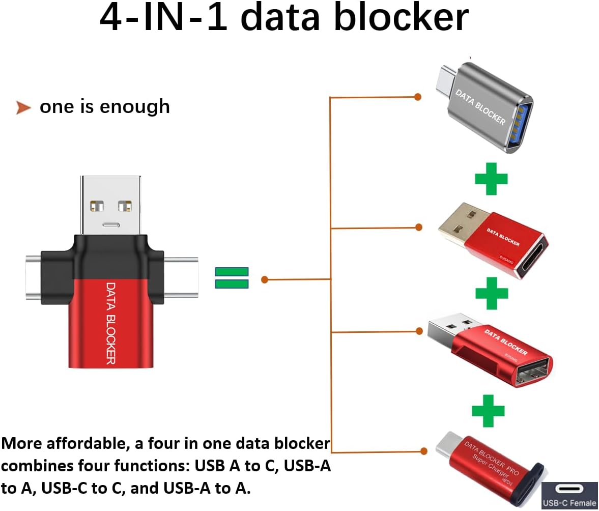 ✅【4-in-1 Data Blocker】 We have combined the USB-A to USB-C and USB-A to USB-A, USB-C to USB-A, USB-C to USB-C data blocker into one, Perfect Compatibility . 4-in-1 data blocker ensures seamless data security across all your Type-C tech gadgets