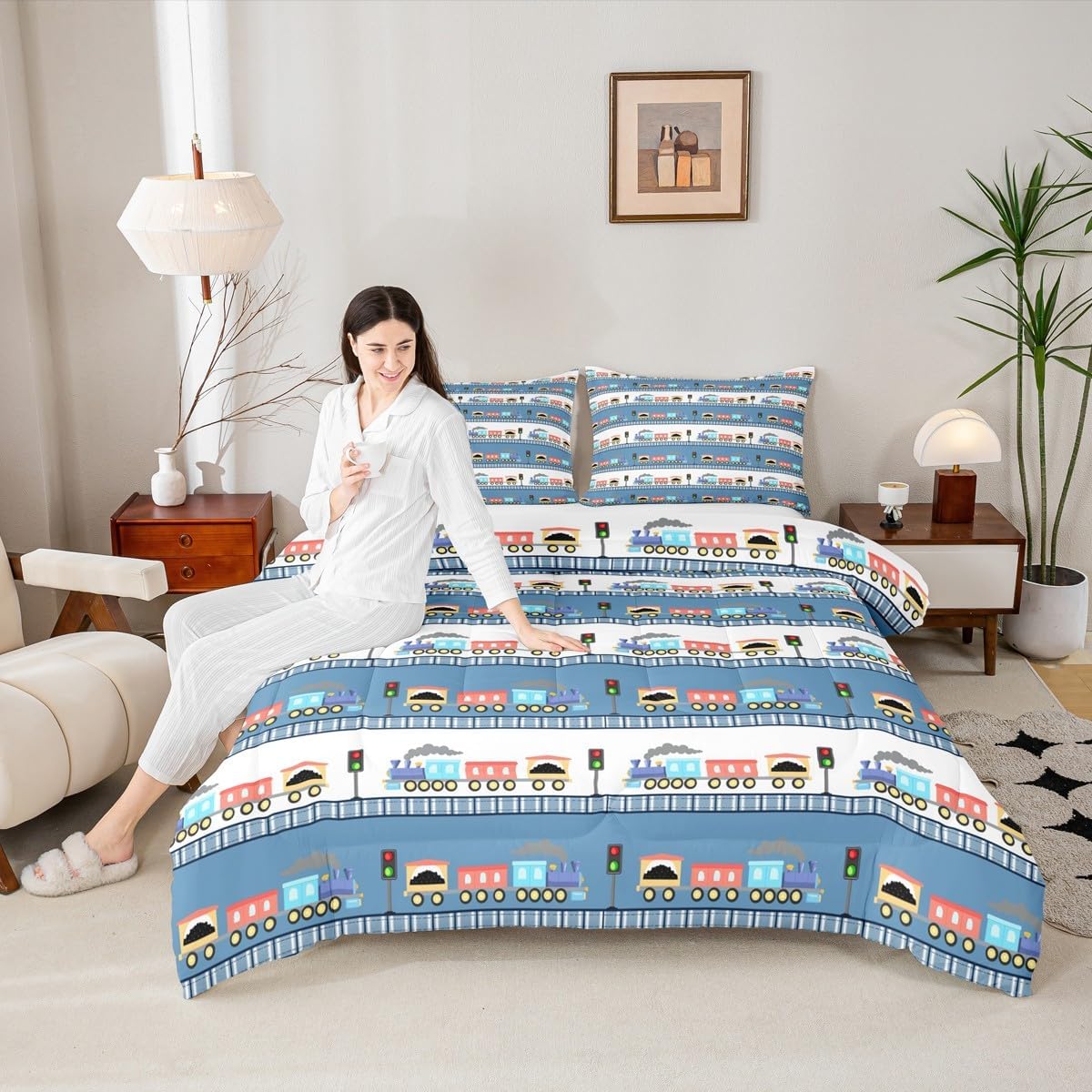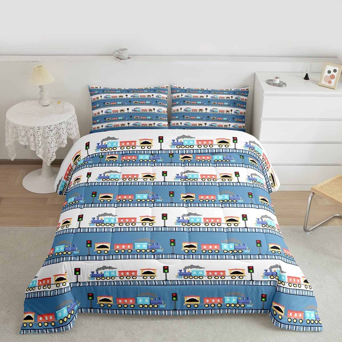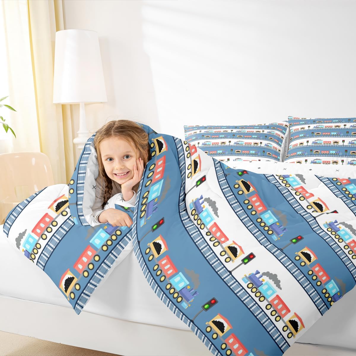 Erosebridal Cartoon Train Bedding Set Twin for Boys Cute Truck Comforter Set Car Themed Bedding Sets & Collections Kawaii Steam Engine Duvet Insert Blue Clouds Print Quilted Comforter for Kids Bedroom