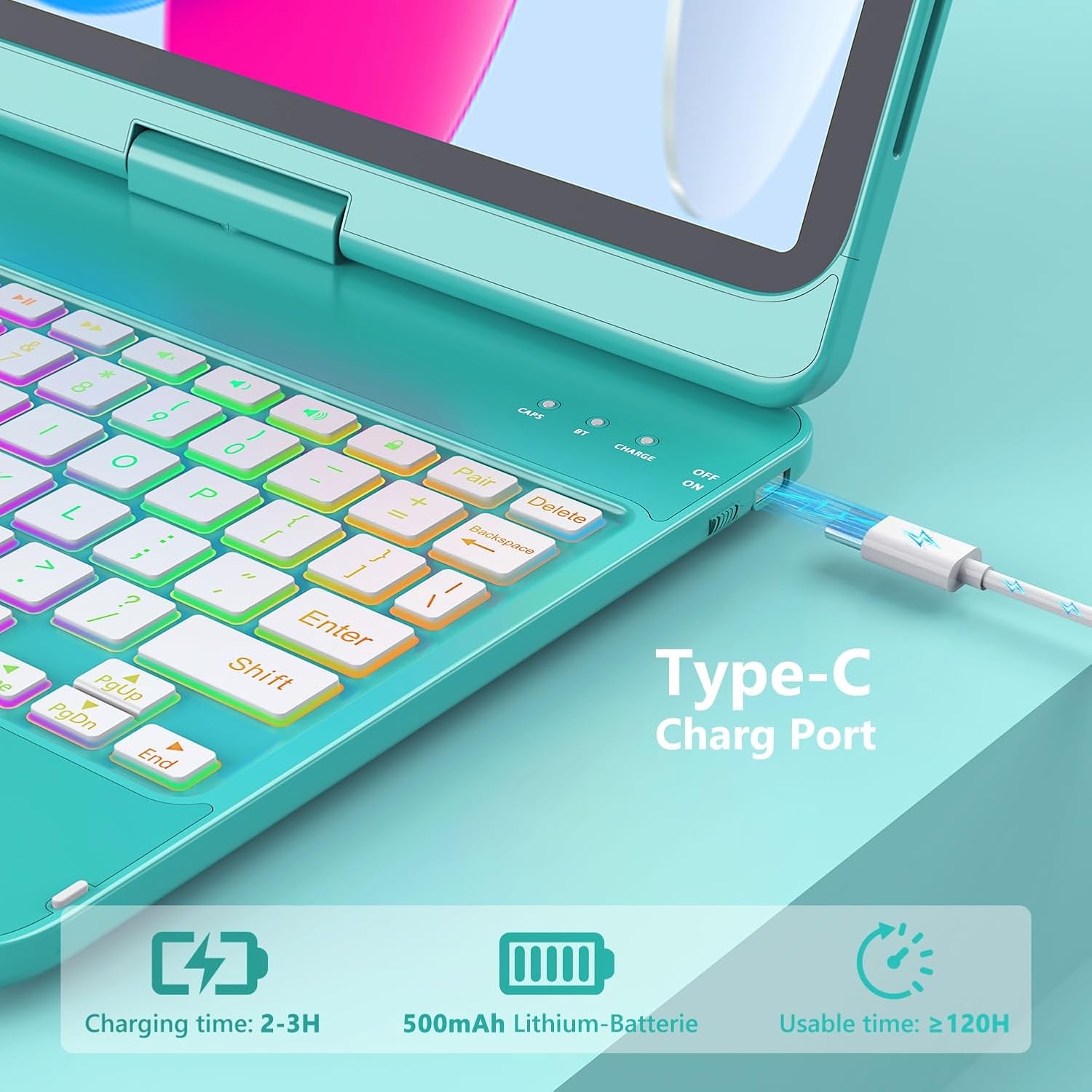 7 Colors Backlit keyboard case for iPad 10th Generation: Type quickly and accurately on a laptop-like keyboard with a full row of tablet shortcuts that allow an adjustable 7-color RGB LED backlight to shine through