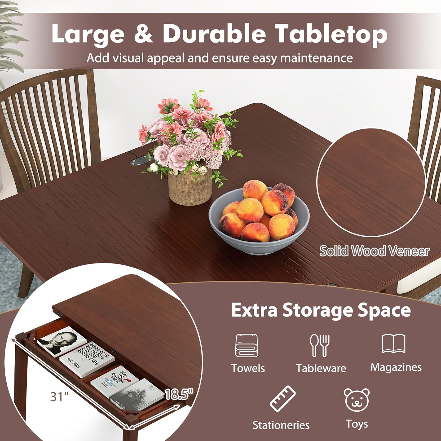 Giantex Folding Dining Table for 4, Extendable Kitchen Table w/Hidden Storage & Rubber Wood Frame, Mid-Century Rectangular Table for Small Space, Kitchen, Dining Room, Living Room, Cherry Brown