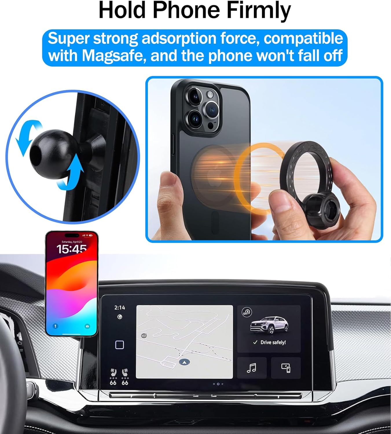 Compatible with Magsafe Case: This car phone mount for Magsafe designed for iPhone 16, 15, 14, 13, 12 series without case, and this Volkswagen Atlas phone holder come with a magnetic metal ring work for other phones. NOTICE: for non-magnetic phones and cases, we will give you magnetic metal ring for phones that are not Magsafe, you need to stick to the center back of phone case.