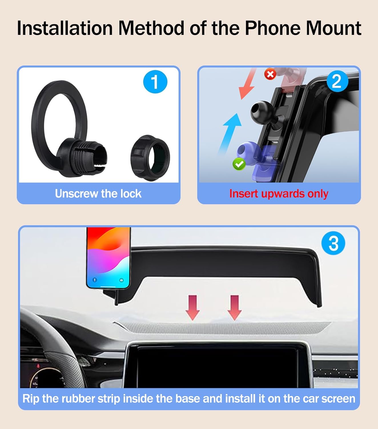 Excellent Material and Easy to Installation: The support skeleton and surface of the holder are specially made of high-grade ABS material, which not only improves the quality, but also guarantees the beauty. Simply attach the car phone holder to the touchscreen, then install the cell phone holder to the base to complete the installation. The smooth edges make it look like an original part of the car, blending in perfectly.