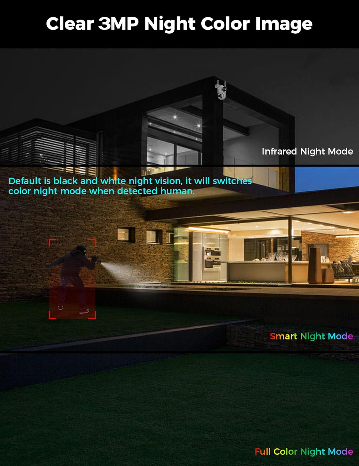 【Clear Color Night Vision & IP67 Weatherproof】 Designed for outdoor installation, this camera features an IP67 waterproof rating, ensuring durability against rain, snow, and harsh weather conditions. Built-in LED lights provide enhanced color night vision and light alarms for added security. It offers three recording modes: infrared, full-color night vision, and intelligent adaptive color night vision—delivering clear footage even in complete darkness.