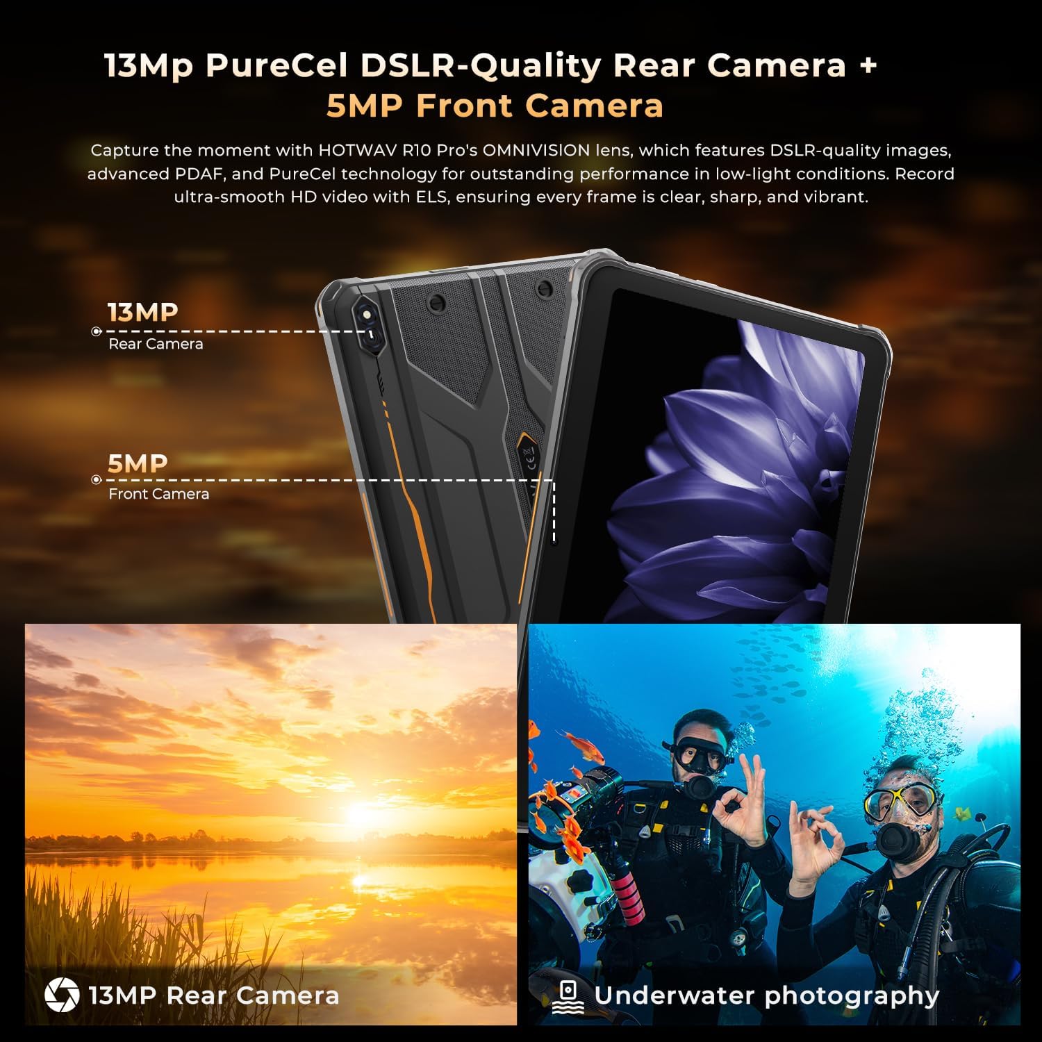 📷【13MP Ultra-HD Camera】HOTWAV R10 Pro rugged tablet uses 4 pieces of ultra-HD glass on the main camera, with a maximum pixel of 13MP, to record beautiful moments with clear pictures. R10 Pro waterproof tablet also has the function of underwater shooting, you can shoot for a short time underwater, and the versatile shooting options allow you to choose your favorite shooting technique.