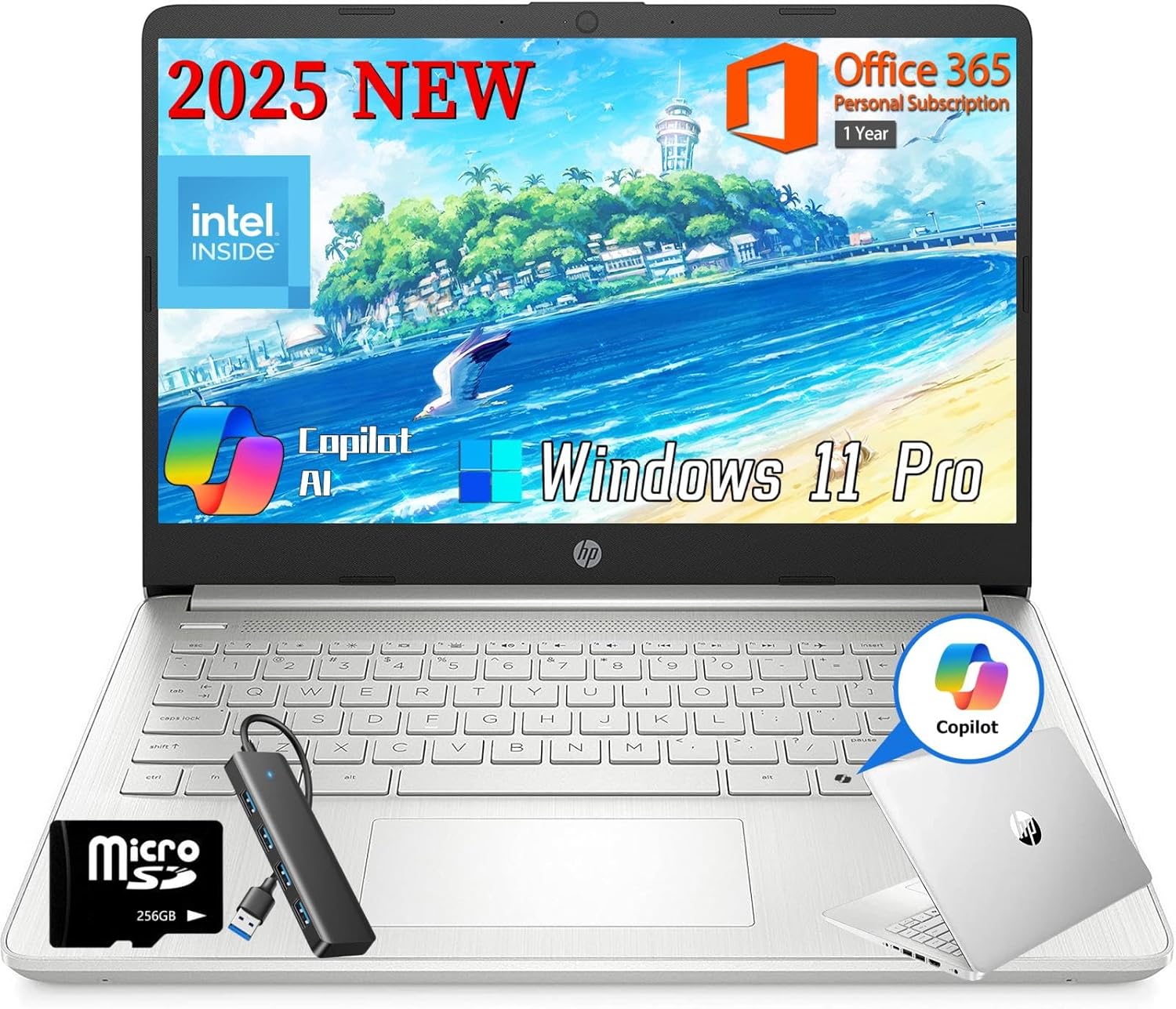 HP 2025 14 Inch Student Business Laptop, Intel Processor N150, 16 GB RAM, 384 GB Storage(128GB UFS+256GB MSD), Copilot Key, AI Powered, 1 Year Office 365, Windows 11 Pro, Natural Silver, w/Accessories