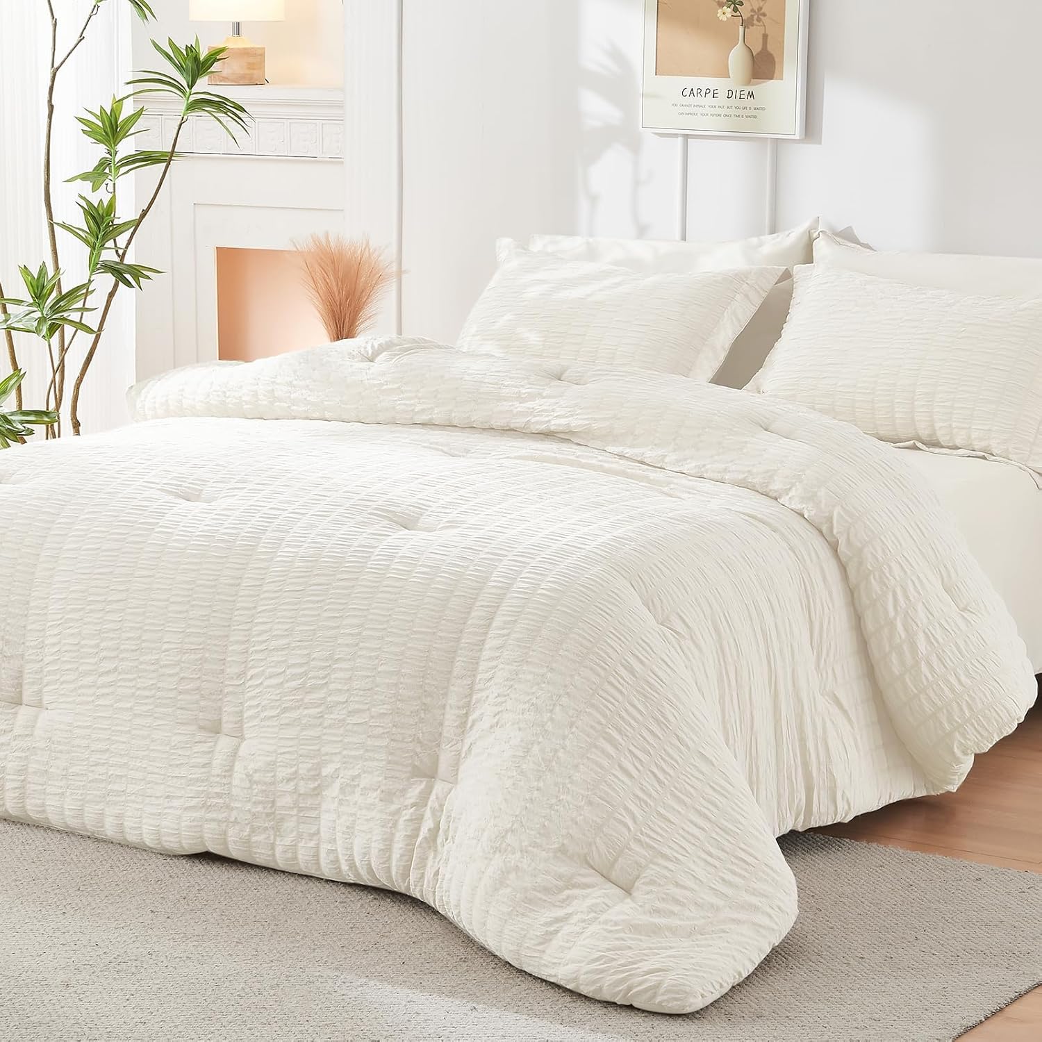 HYMOKEGE Ivory Queen Comforter Set Seersucker 7 Pieces, All Season Luxury Bed in a Bag for Bedroom, Bedding Set with Comforters, Sheets, Pillowcases & Shams