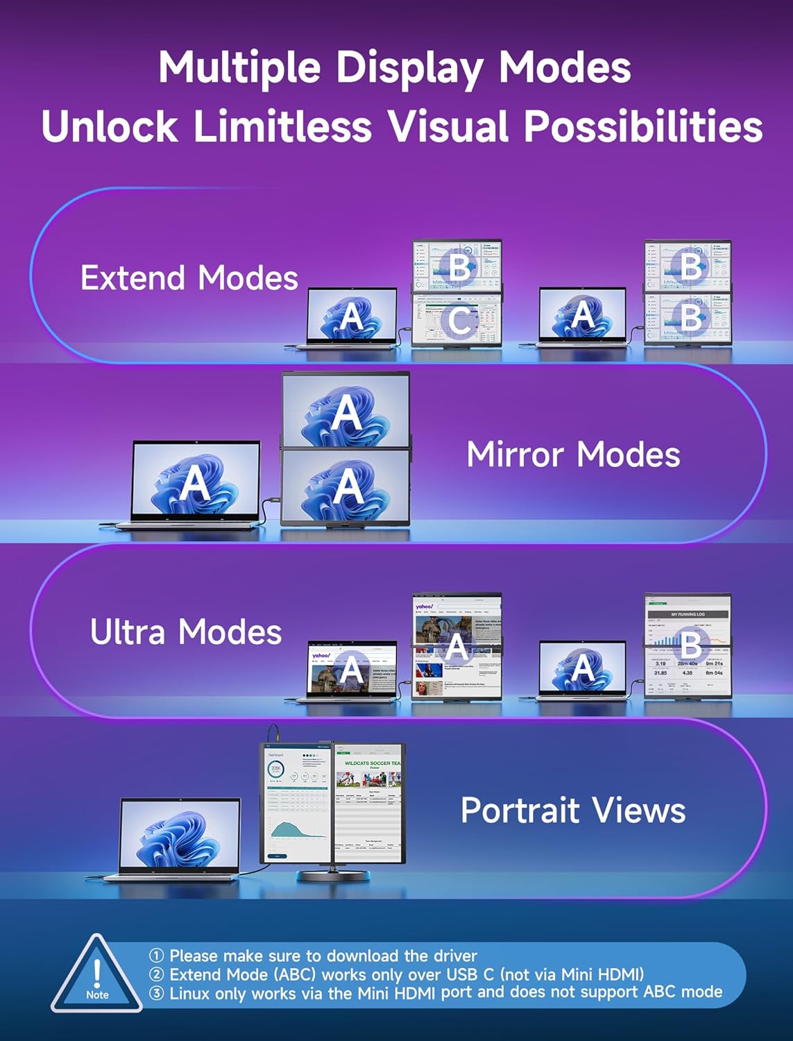 【Unlock Endless Possibilities】Explore three display modes with the FlipGo Pro 15.6″ dual laptop screen extender: 1. Ultra Mode for expansive views, 2. Mirror Mode for overlapping multitasking, 3. Extend Mode for side-by-side work(Note: If you want to display three different screens, please make sure to install the driver. Mode support varies by system and port. See product images for details or contact our support team.)