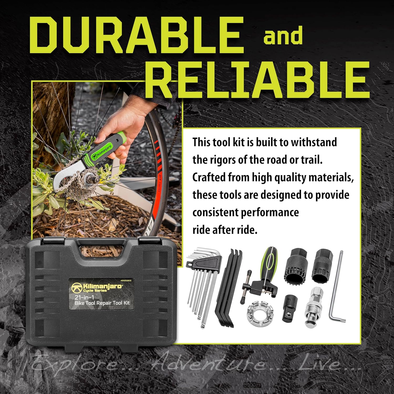 Kilimanjaro Cycle Series 21 Piece Bicycle Repair Tool Kit Set, Spoke Wrench, Tire Levers, Hex Keys, Pedal Spanner, Chain Tools – 910532ECE