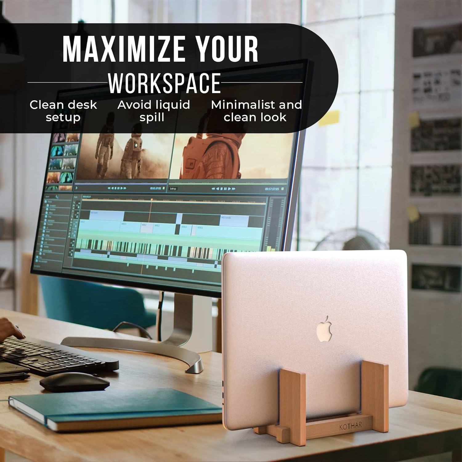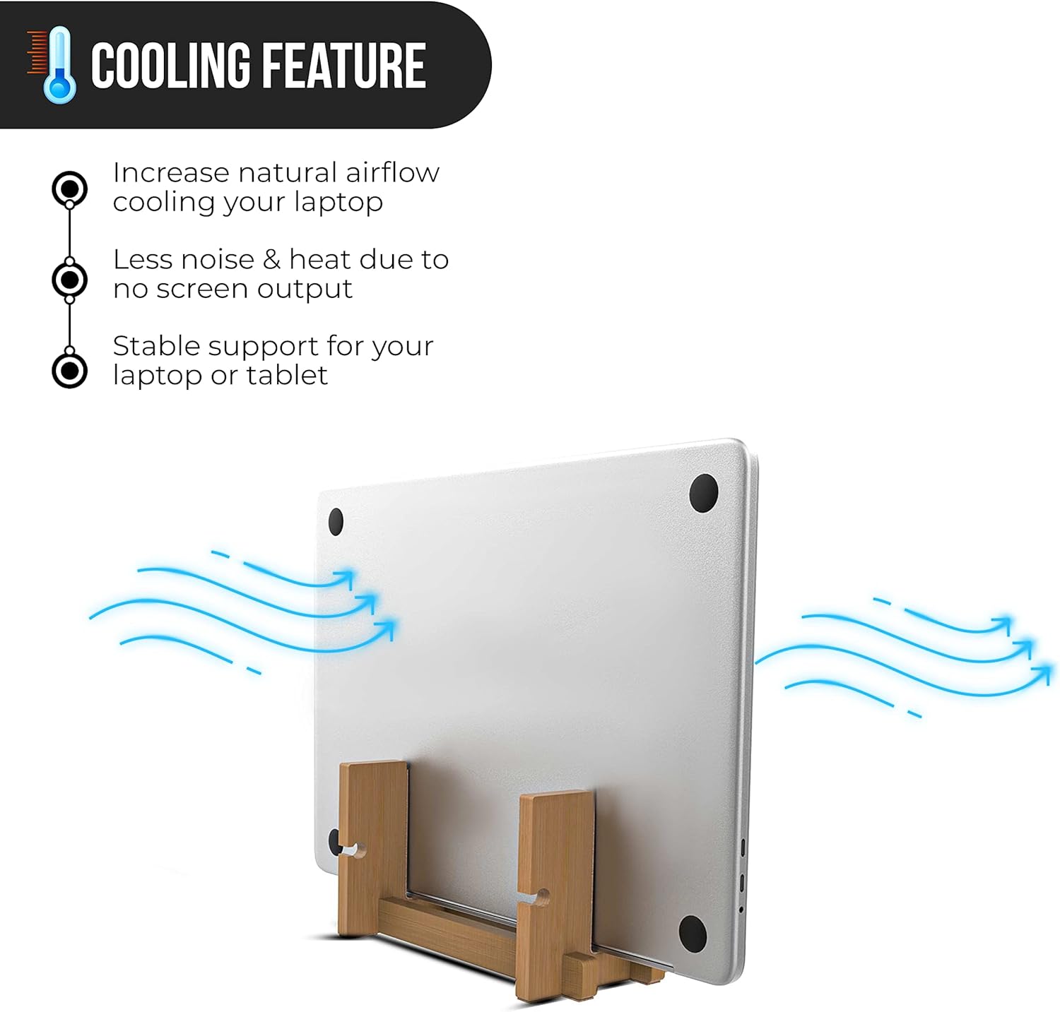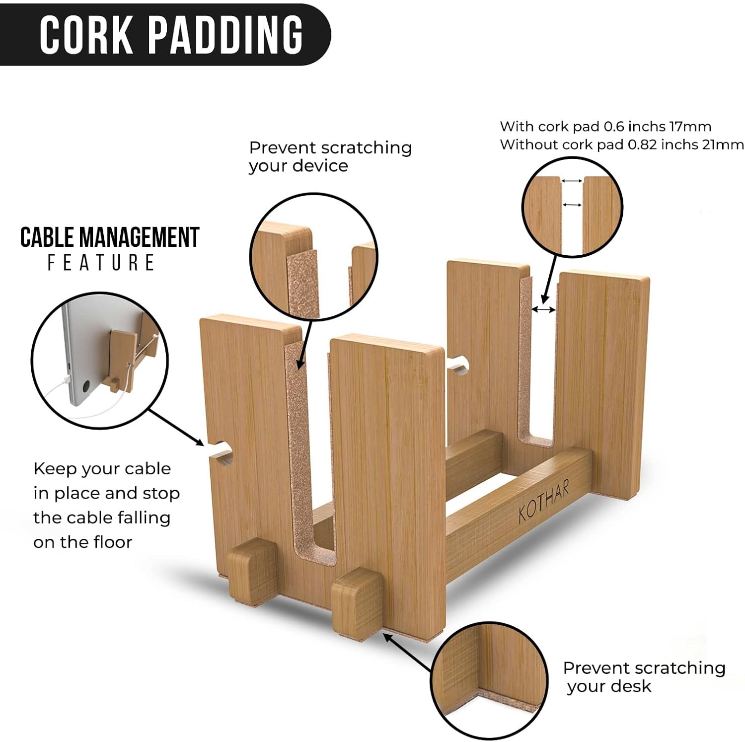 KOTHAR VERTICAL LAPTOP STAND Usually, you keep your laptop flat on your desk, but this takes up quite some space. Take for instance a 13-inch MacBook Pro. Flat on your desk it takes up 11.97 in (30.4 cm) to 8.36 in (21.2 cm). However, with the Kothar vertical laptop cradle (4″ x 7″) allows you to use or intelligently display your laptop while it’s closed and in an upright position to maximize your valuable desk space.STURDY BAMBOO FRAME & PADS PREVENTS SLIDINGThe stand is made of high quality bamboo and has a wide non-slip rubber base to make sure that your laptop stands securely on your desk. PROTECTIVE PADDINGOn the inside, it has soft cork padding to hold your laptop securely and protect it from scratches. WIDE COMPATIBILITY FOR MAC & PC NOTEBOOKSThe stand fits all laptops between .8 inchesEASY PORT ACCESS AND CABLE MANAGEMENTWhile your laptop is in the stand all ports are fully accessible, so you can connect it to the power, monitor, keyboard, and mouse. Integrated Cable management design keeps your cable connections handy and accessible, while keeping them from falling when disconnected. BETTER AIRFLOWThe bamboo and wood material and open design allow all-around natural air flows to keep your laptop cool.FREE-WARRANTYWe believe in our products. That’s why we back them all with a one-year warranty and provide friendly, easy-to-reach support for any of your questions.