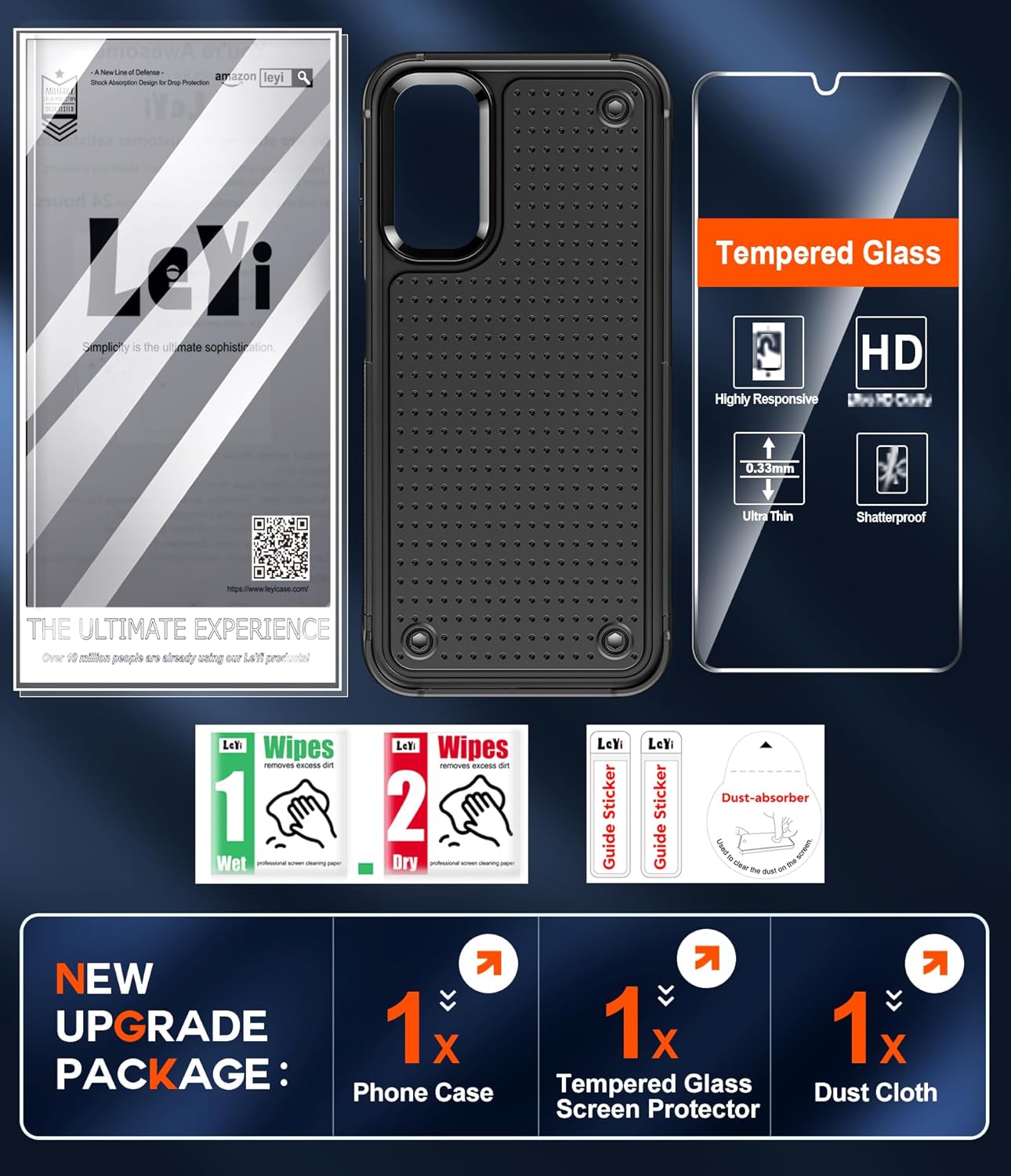 LeYi for Samsung Galaxy A14-5G Phone Case: with Glass Screen Protector Accessories, Heavy Duty Shockproof Dual Layer Hard PC Textured Back & Soft TPU Cover for Galaxy 14A Mobile Smartphone, Black