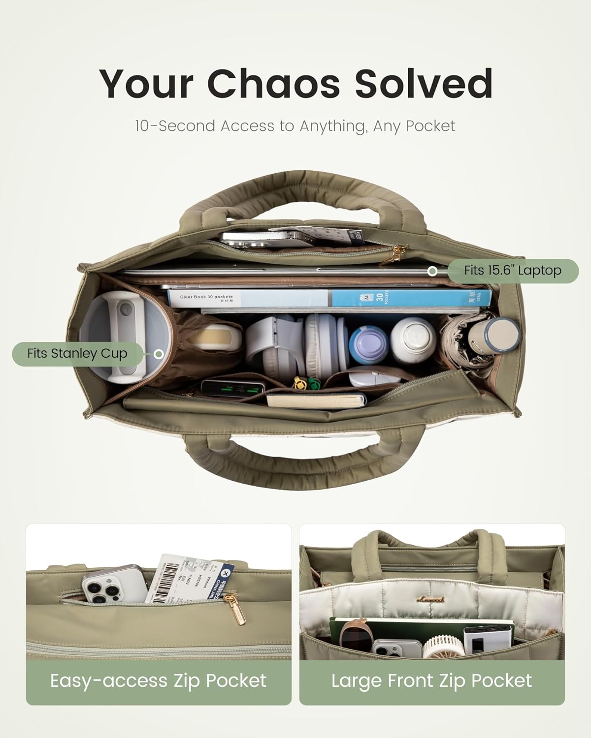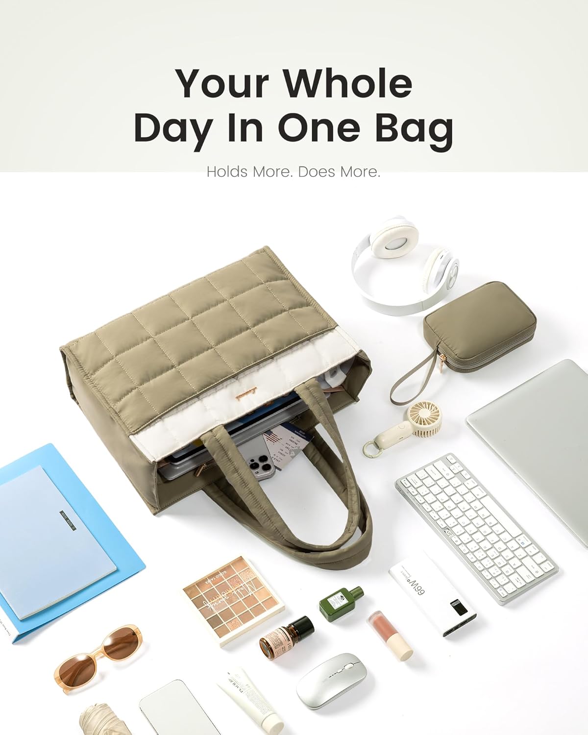 LOVEVOOK Tote Bag for Women, Puffer Work Handbag 17 Inch Laptop Purse for Nurse Teacher, Large Quilted Travel Tote Shoulder Bag with Zipper for College Office Clinical Gym, Green