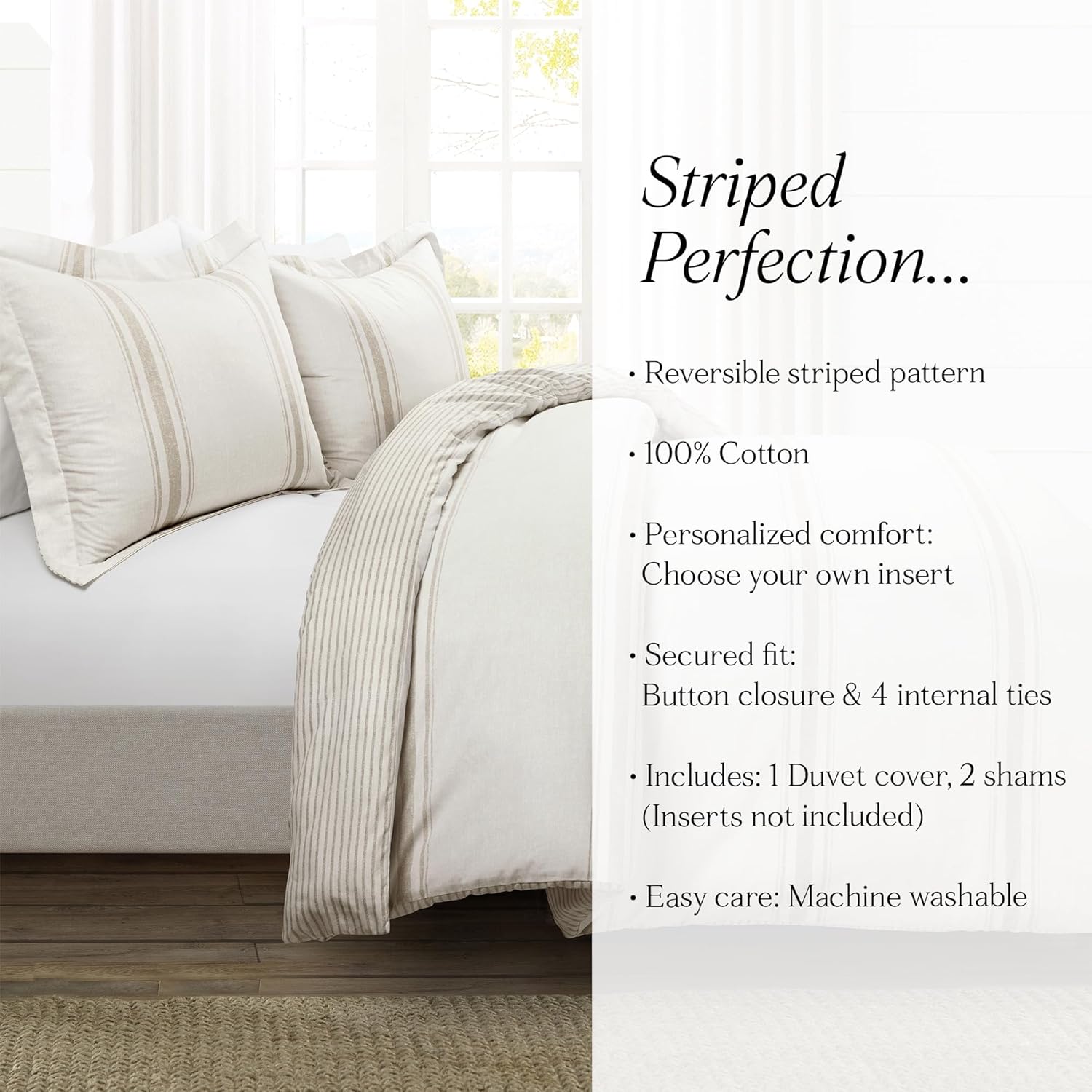 Decorate your primary bedroom, guest bedroom, teen’s bedroom, or dorm room with the traditional farmhouse style of our Farmhouse Stripe Reversible Cotton Duvet Cover Set. The printing on the front of this set is reminiscent of shiplap beams, with a pattern of thin and thick colored stripes on a cream background. This charming rustic style duvet cover set is reversible, giving you two stylish looks in one great set! The reverse of both the duvet cover and shams features a pinstripe pattern in the same colors. Either look is great for all ages. This 3 piece set includes 1 reversible duvet cover and 2 matching pillow shams. This is a look we are sure modern farmhouse fans will love, but it can also work is many home decor styles such as traditional, coastal, or country cottage. This farmhouse style duvet cover set is made of 100% cotton fabric and is very soft to the touch. The weight will depend on the fill you choose. Add your favorite insert weight or change it seasonally for year-round comfort tailored just for you. Easily secure your duvet cover with the button closures and use the four internal corner ties to keep your comforter in place. Designed for effortless maintenance, it’s easy to care for this bedding set. Simply machine wash cold on the gentle cycle and tumble dry low. If needed, use non-chlorine bleach for cleaning or an iron on low heat to release wrinkles. Please refer to the product labels for full care instructions.