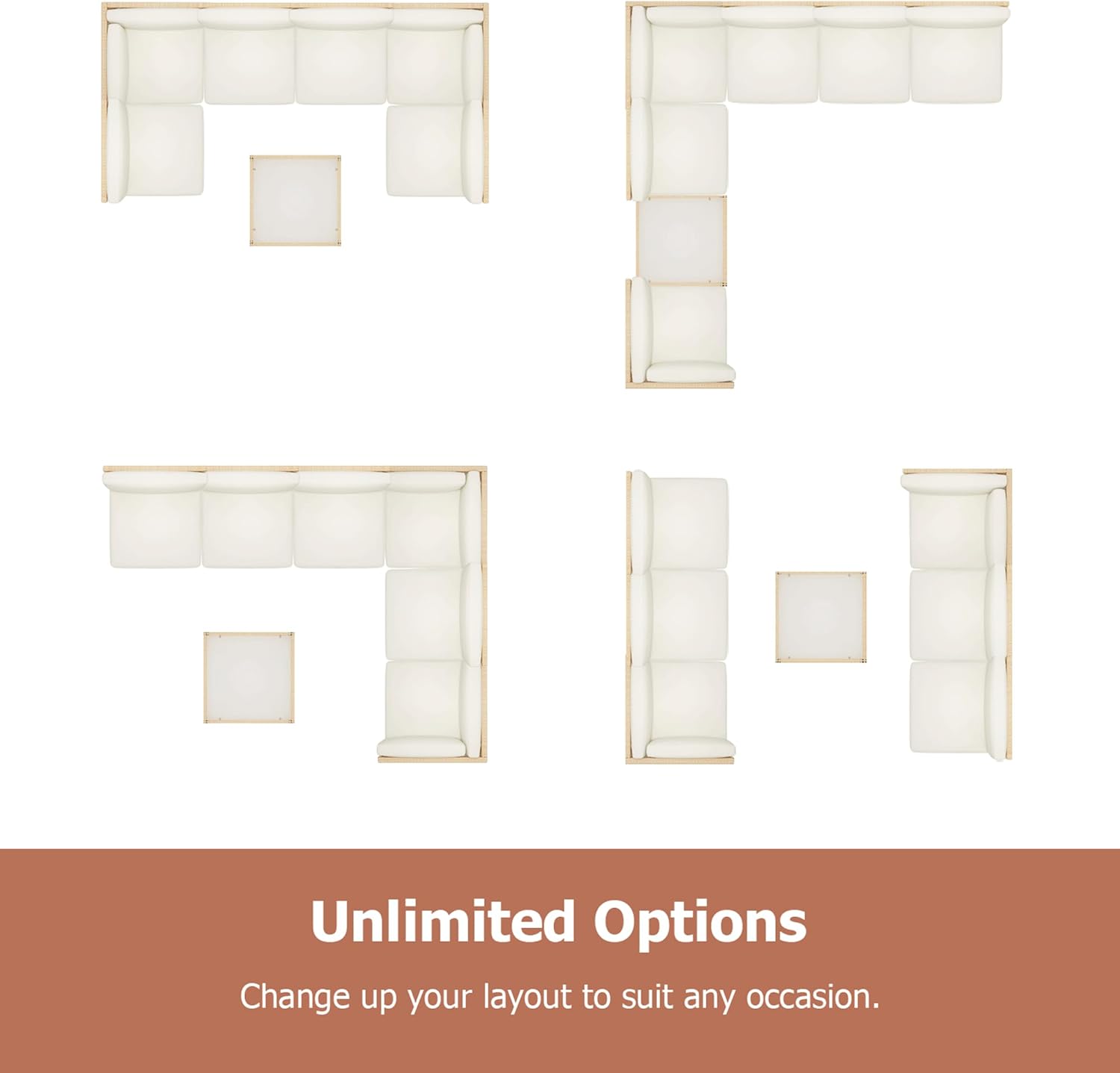 Personalized Outdoor Layout:Enjoy modular flexibility with our outdoor sectional, including 2 corner chairs, 4 armless chairs, and 1 glass-top coffee table. Easily customize layouts to suit any space, from cozy patios to large gardens. Adjustable feet ensure stability on uneven surfaces, while included connector clips keep the seats firmly together. Built for durability and comfort, each seat supports up to 350 lbs, offering a versatile and stable setup for all your outdoor gatherings