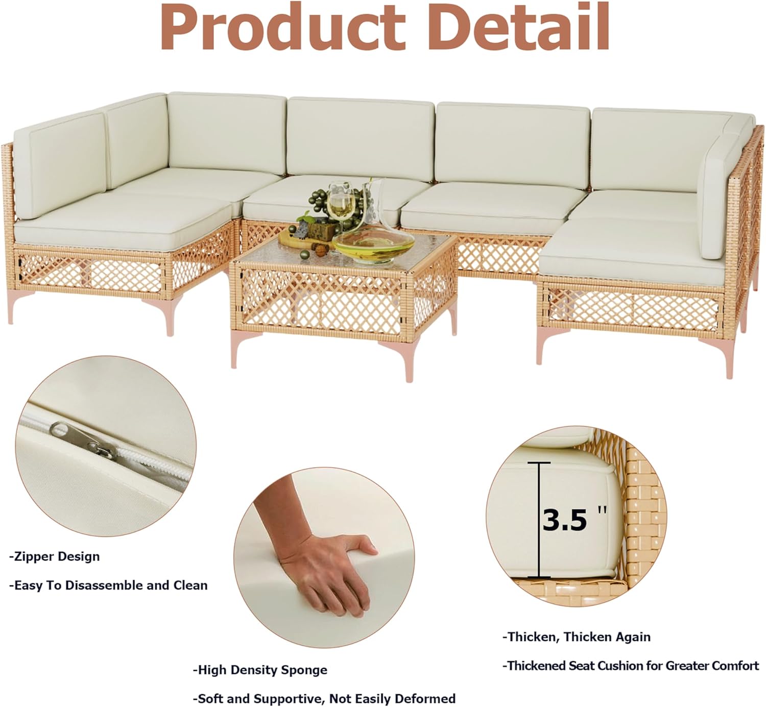 LYNSLIM Outdoor Patio Furniture Set, Wicker Outdoor Sectional Set, Boho Patio Conversation Sectional Sofa with Large Tempered Glass Coffee Table and Waterproof Cushion (7-Piece Thickened)