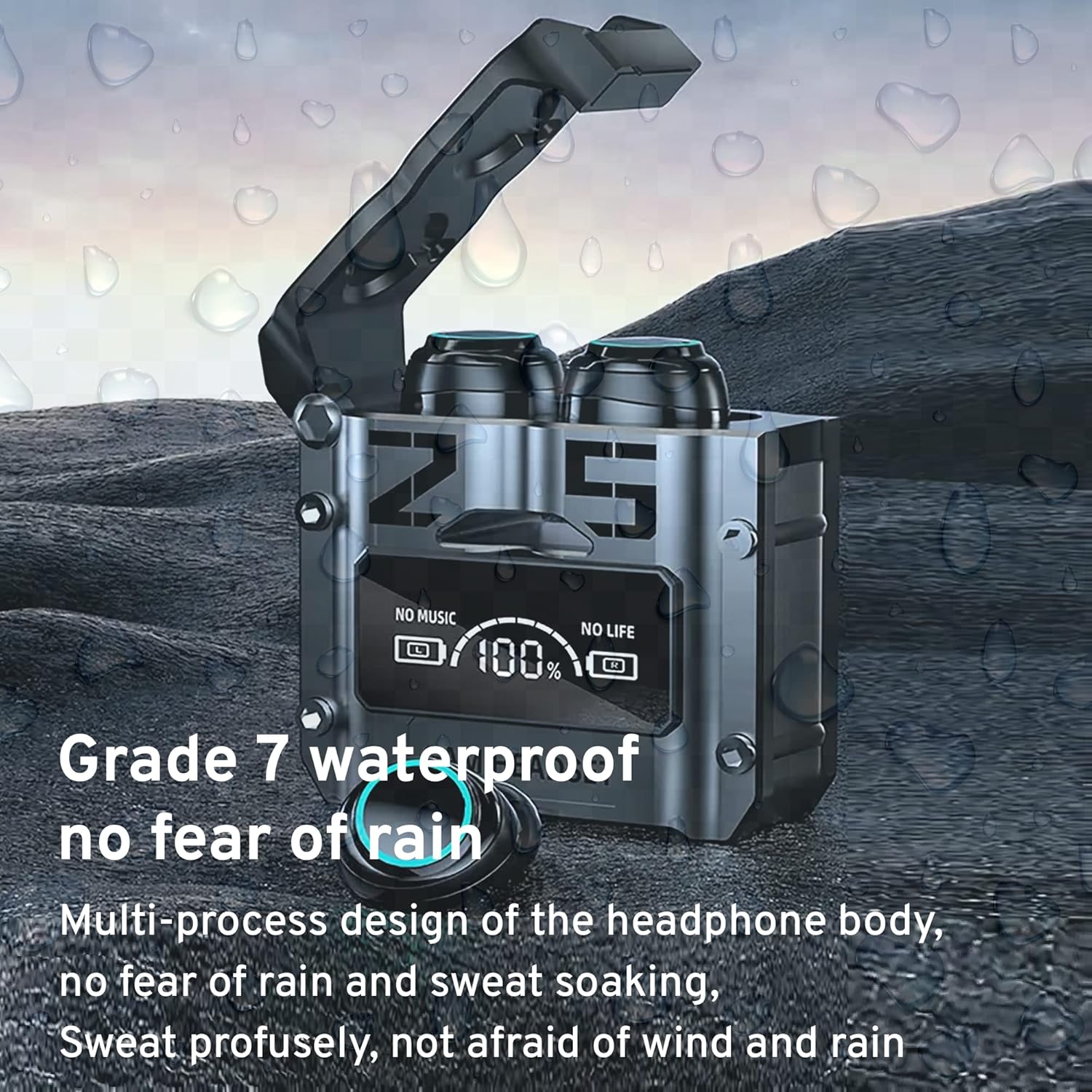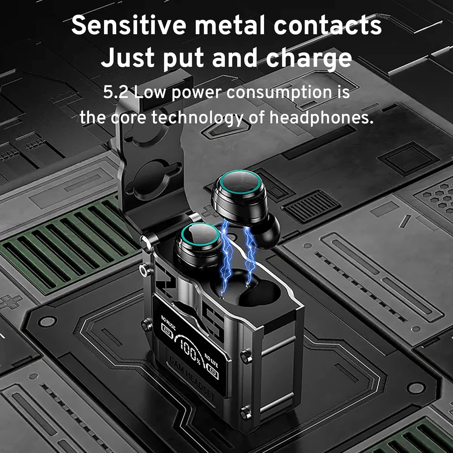 [Sensitive metal contacts just put and charge & Magnetic hatch cover Toggle to open] The hatch cover has a built-in sensitive magnet, No need to force it open, It can be opened and closed with just a slight toggle. Sensitive metal contacts just put and charge 5.3 Low power consumption is the core technology for headphones, It adopts the design of a mini energy-gathering cabin, which can be charged immediately after discharge.