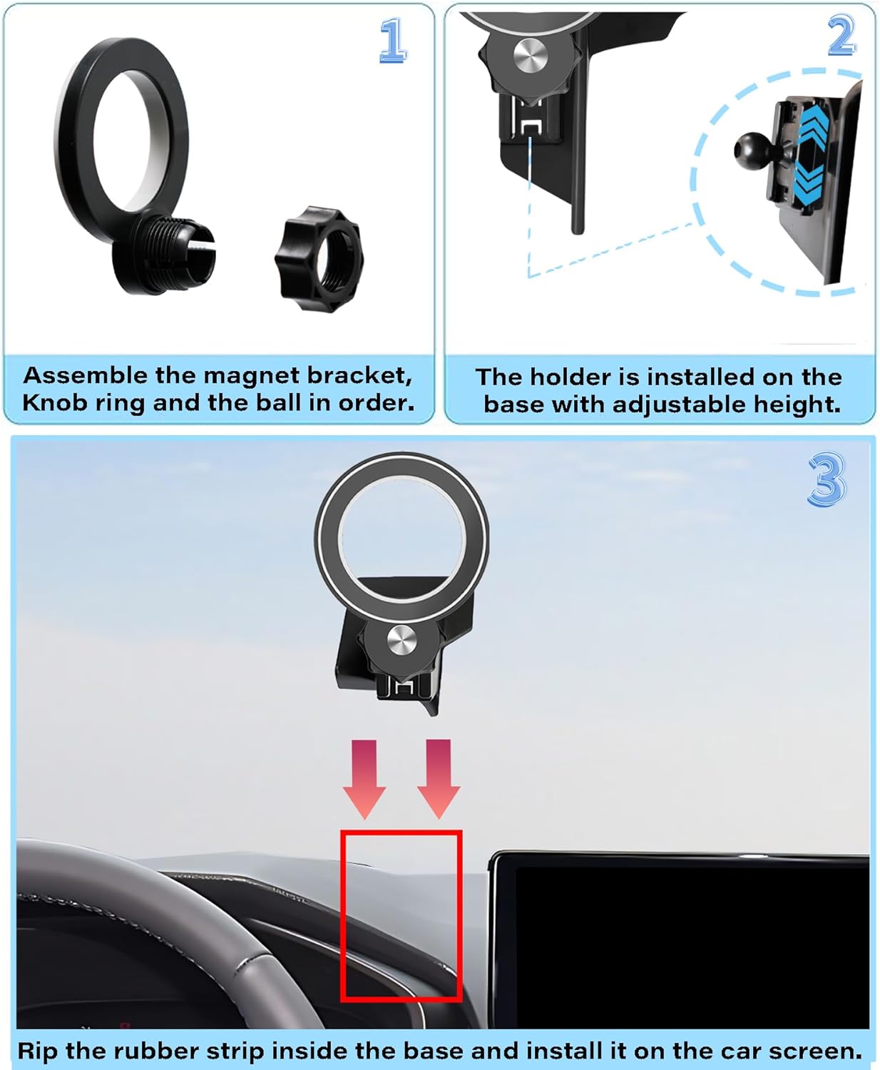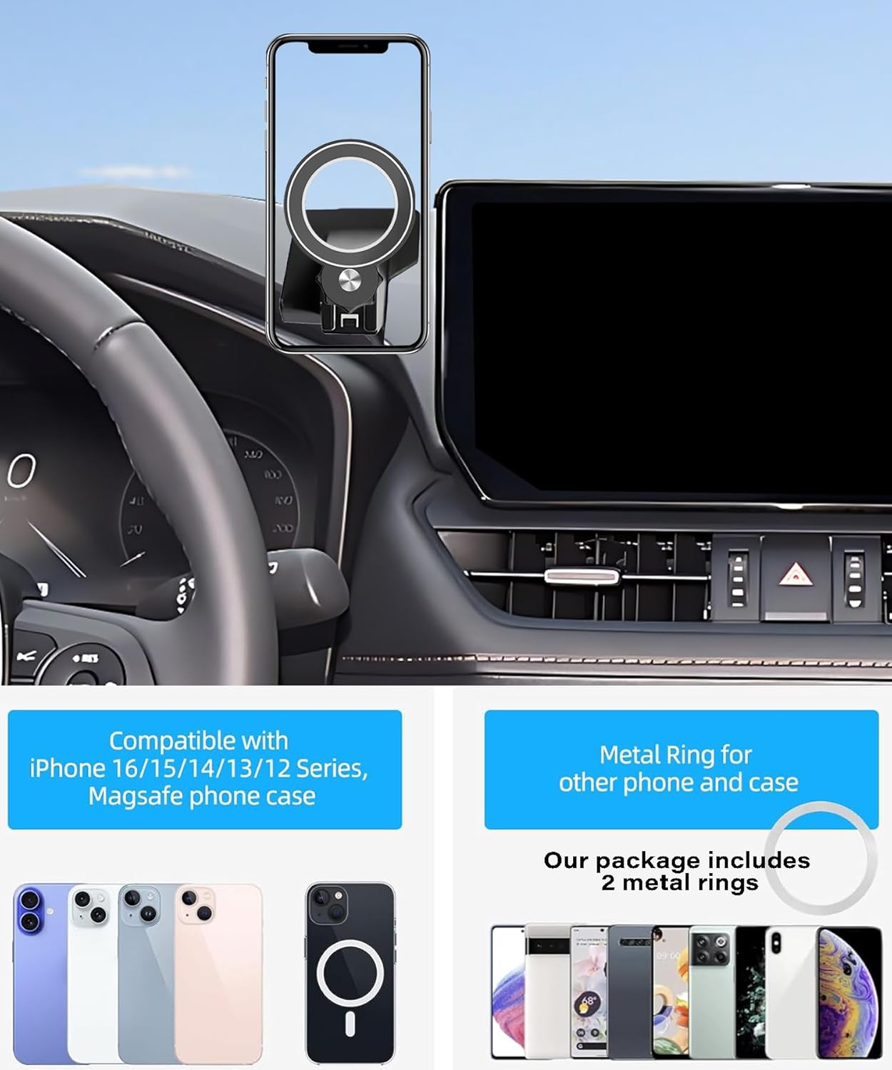 Package includes the mount and two metal rings for universal compatibility. This thoughtful solution keeps your phone within reach while maintaining focus on the road.