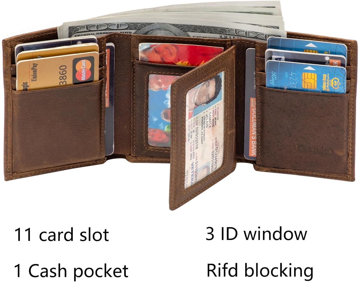 Product Size: The Size of this Leather Bifold Wallet is 3.5 x 4.4 x 0.75 Inches. 11 card slots + 1Cash Pocket + 3 transparent ID windows (photo windows)