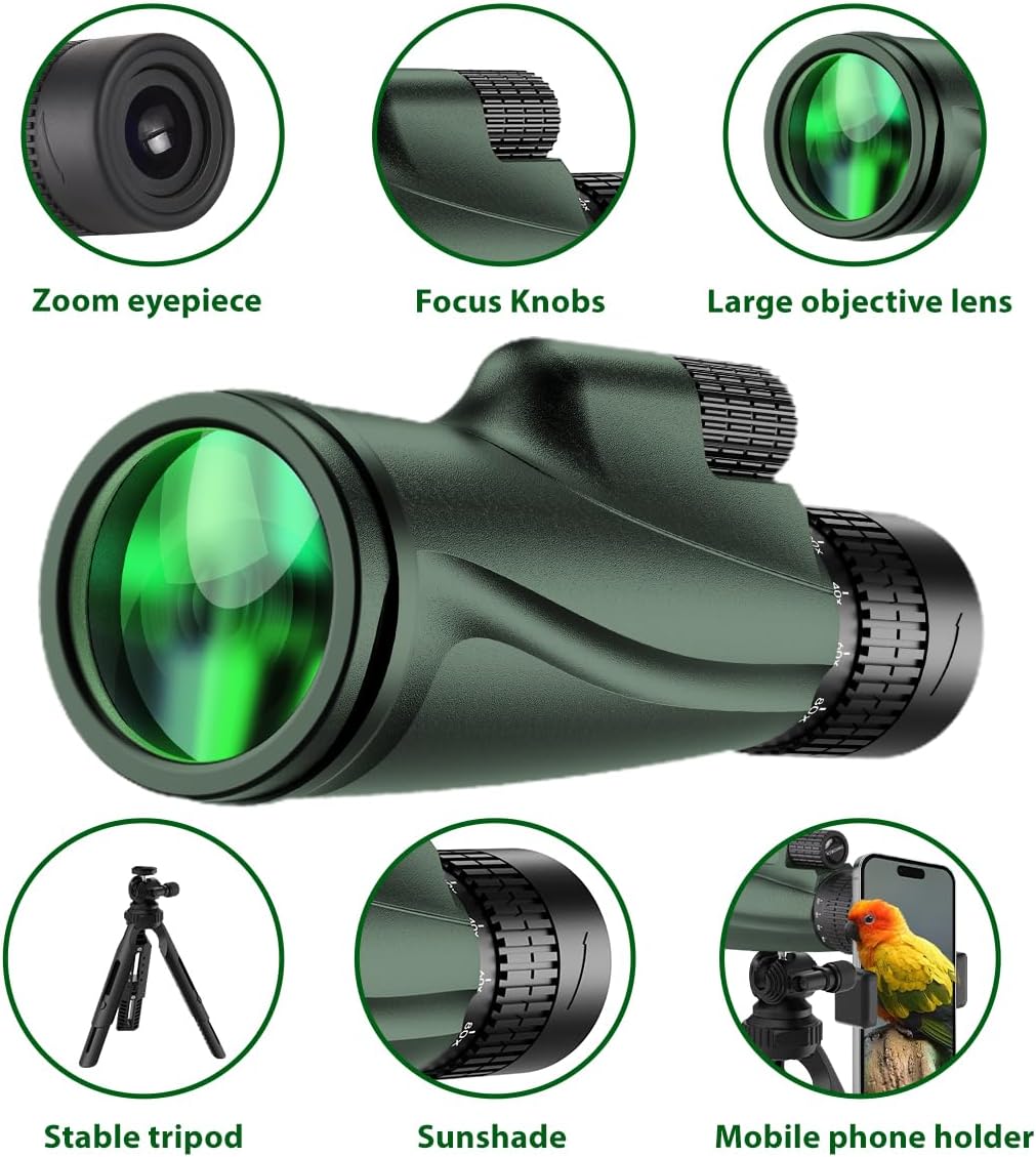 Monocular Telescope 80 x 100 High Powered Monoculars for Adults with Tripod, Monocular for Smartphone Suitable for Bird Watching Larger Vision Monoculars for Adults with BAK4 Prism & FMC Lens Green