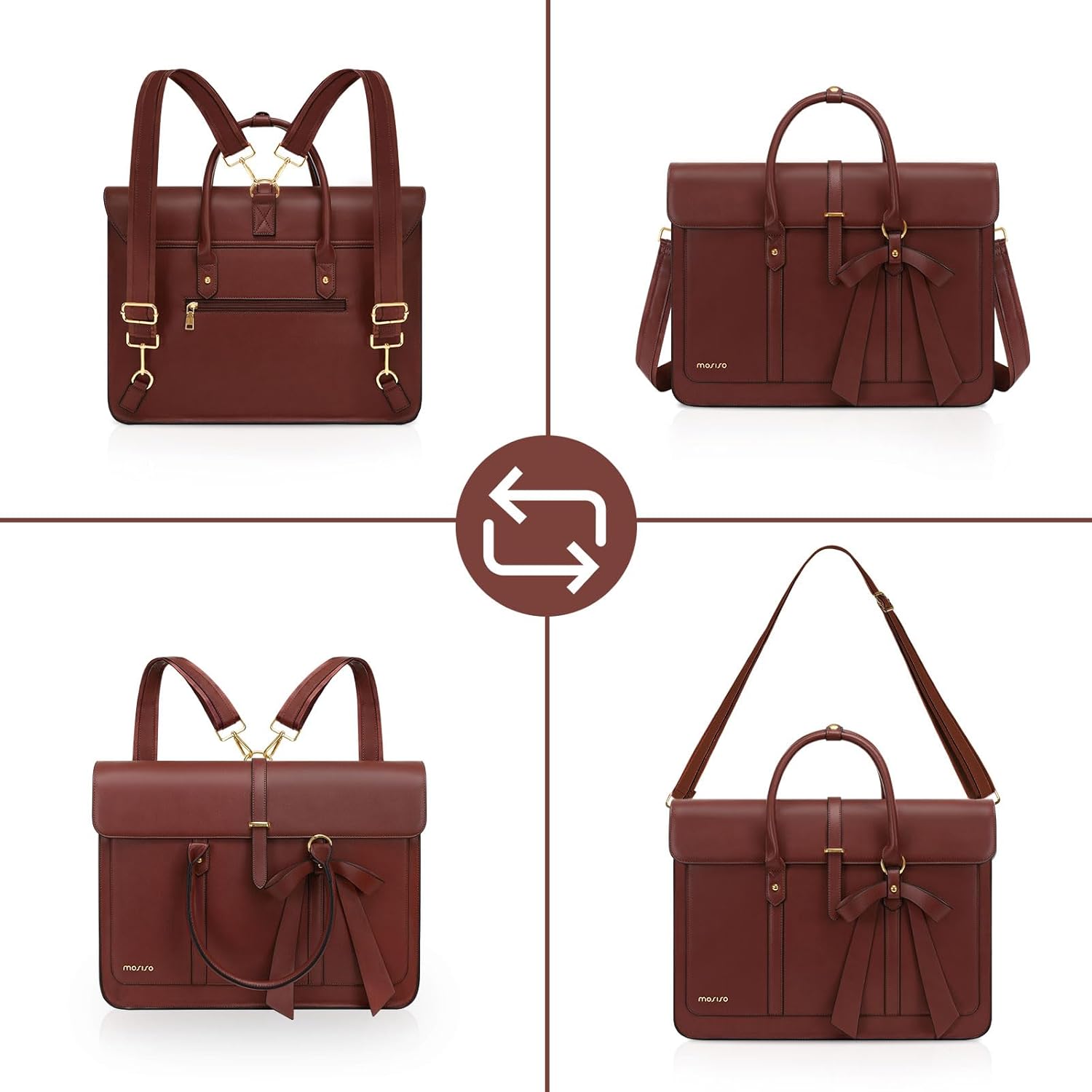 MOSISO Laptop Bag for Women, 13-14 inch PU Leather Laptop Shoulder Bags Convertible Backpack, 13.3 inch Messenger Bags Casual Handbag Work Briefcase Travel Computer Bag with Bowknot, Brown