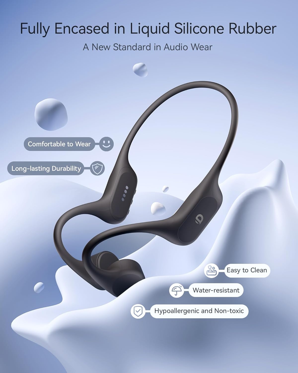 [32g Ultra-Light Design – Liquid Silicone & Titanium Frame] – Weighing just 32g, the headphones feature a soft liquid silicone casing for a comfortable fit. The flexible titanium alloy frame adapts to various head shapes, ensuring durability and lightness. Reinforced with nylon, it resists wear and tear, regaining shape under stress to reduce damage.