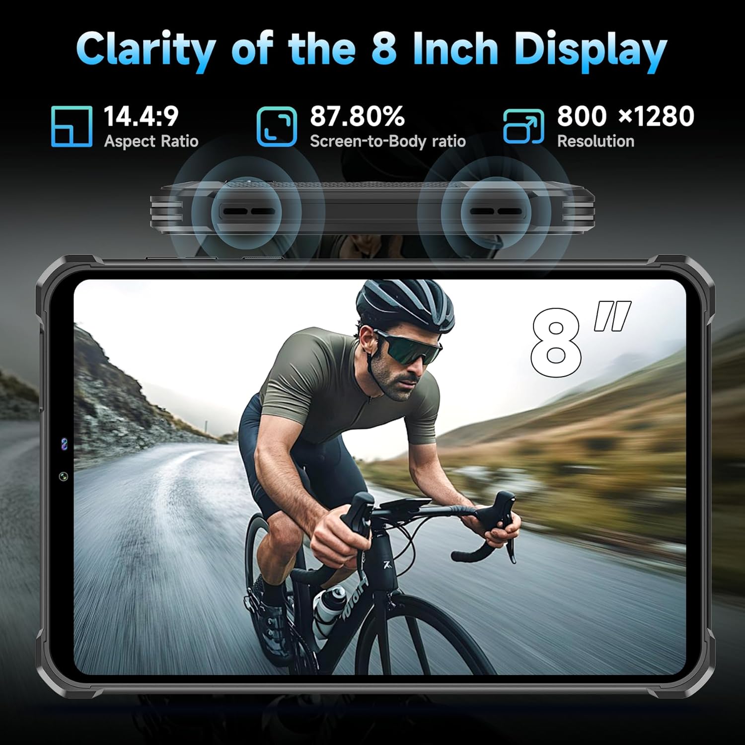 8-inch Rugged Tablet & Wrist strap: OUKITEL RT3 Plus android tablet is equipped with an 8-inch HD display,1280*800 high resolution, Whether you’re editing photos, streaming movies, or presenting work, this tablet transforms every glance into an unforgettable visual experience, 420nit brightness , when you hold in your hand to watch TV or use it on sunny days, it can bring you a clear visual enjoyment. RT3 plus also comes with a wrist strap for your convenience, allows you to hold your tablet more comfortably and conveniently.(size: 8.11*5.27*0.64In,and weighs only 1.37Ib)