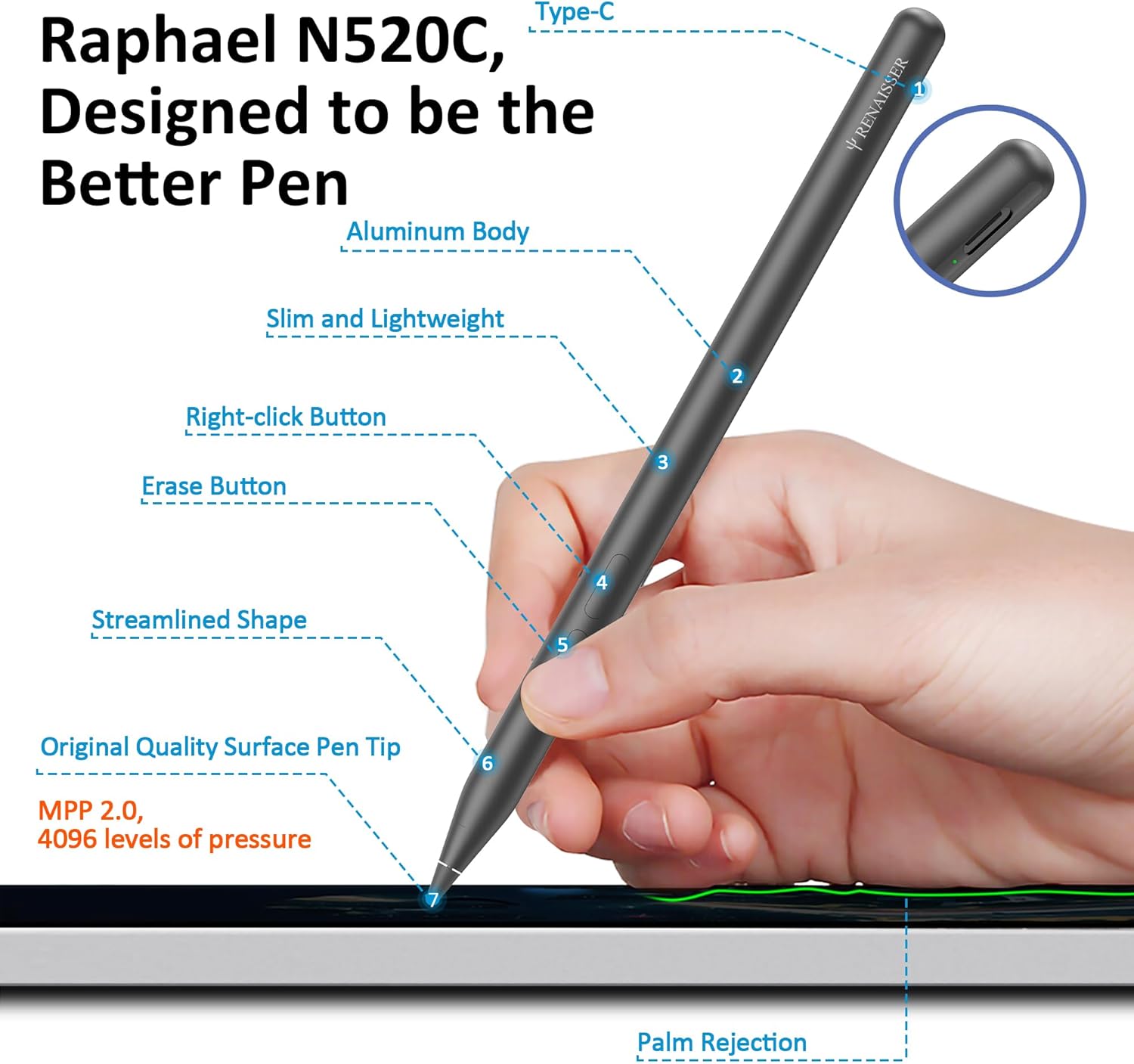 RENAISSER Microsoft Surface Stylus Pen, Raphael N520C from Taiwan, Designed in Houston, USB-C Charging, 4096 Pressure & Tilt Sensitivity, Match Surface Pro 12 & 11 & 10 & 9 & 8 & 7/ Book/Studio/Go