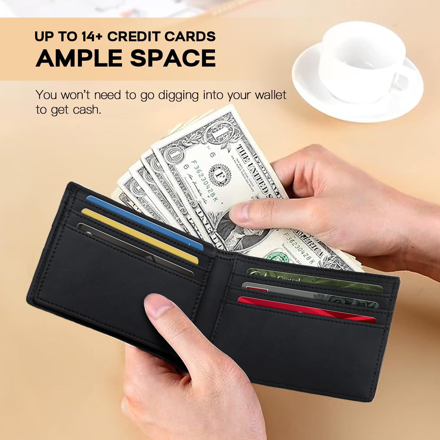 Slim & Spacious: With dimensions of 0.59″ x 4.33″ x 3.15″, this wallet has 14 card slots,include 2 ID windows, and a cash slot. It’s designed to be thin yet hold a lot.