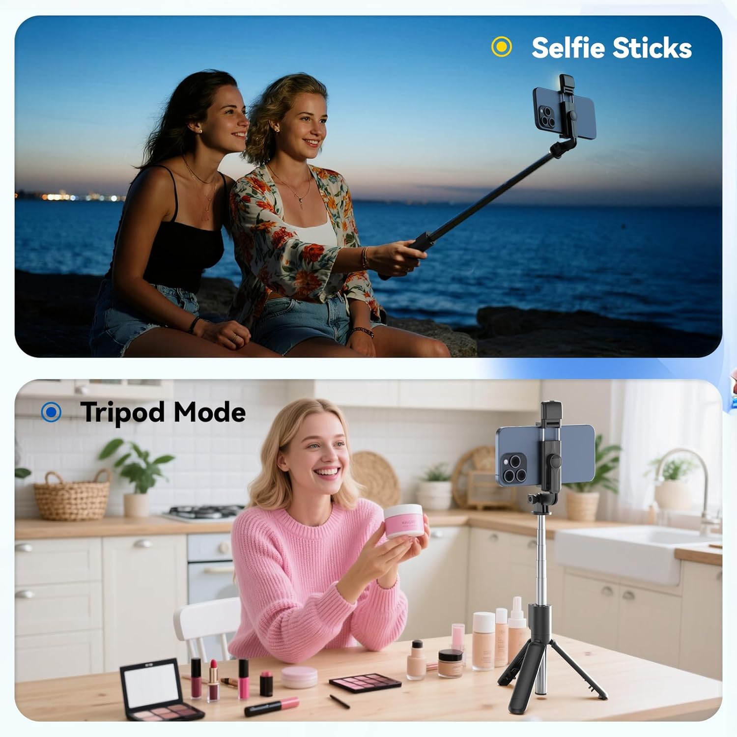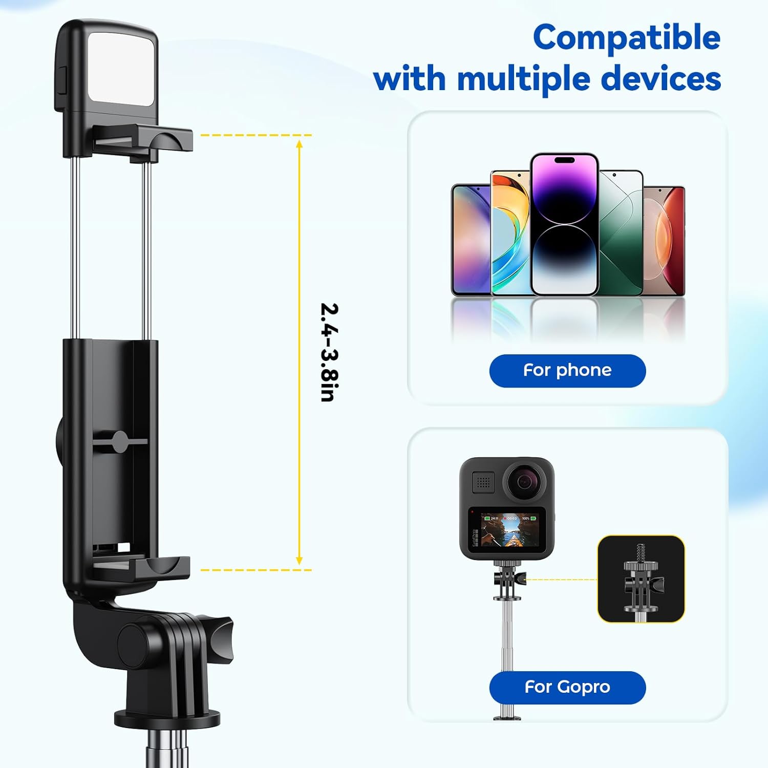 [Multi-functional Selfie Stick] This product can not only be used as a selfie stick, it can also be used as a cell phone holder when needed. under normal circumstances, the shorter the tripod is stretched out, the more stable it will be on a flat surface