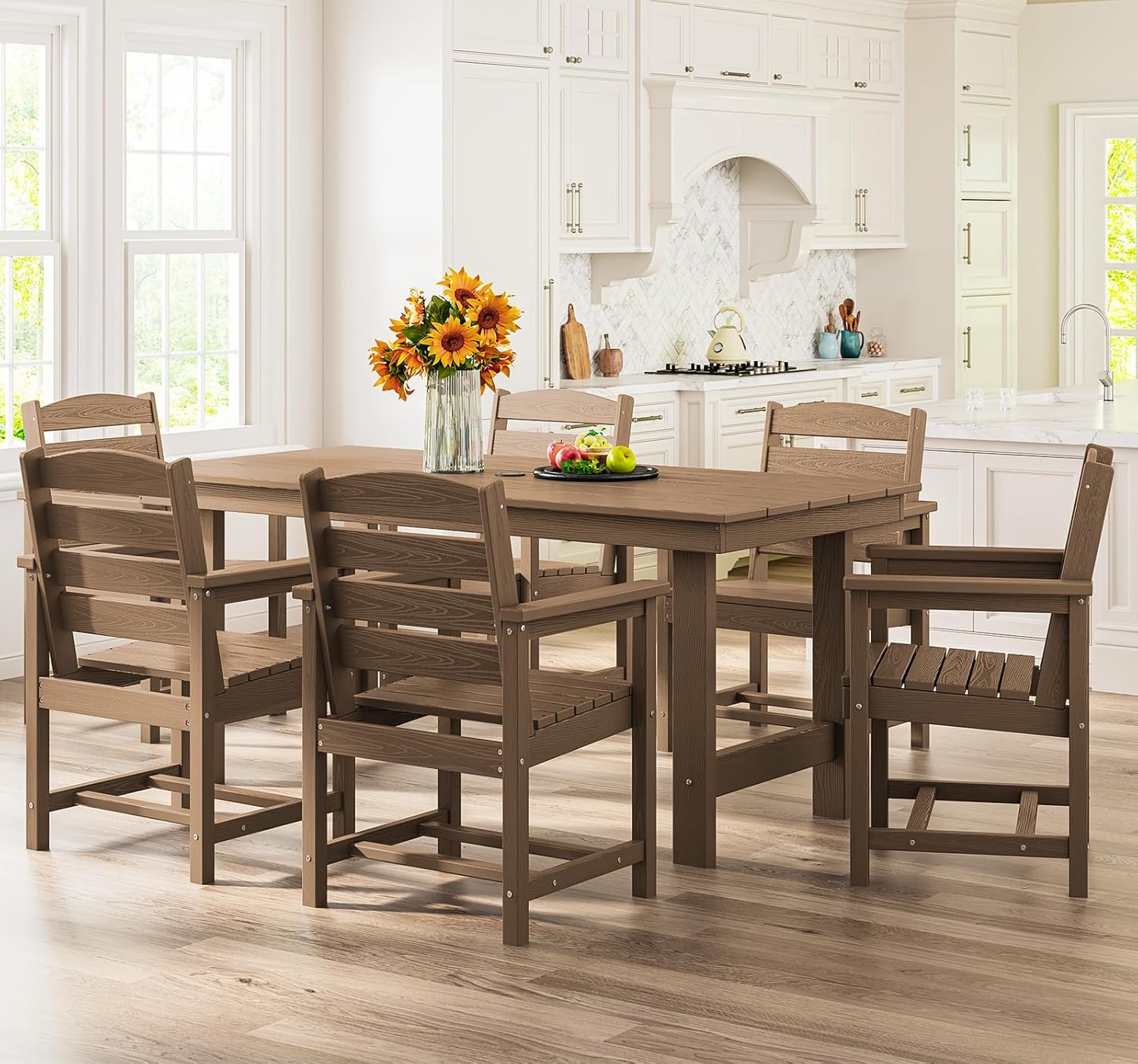 SERWALL 7-Piece Patio Outdoor Table & Chairs, HDPE Dining Set with Umbrella Hole & All-Weather Design for Lawn, Backyard, Poolside, Brown